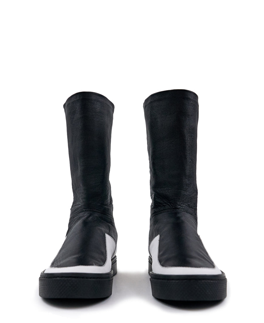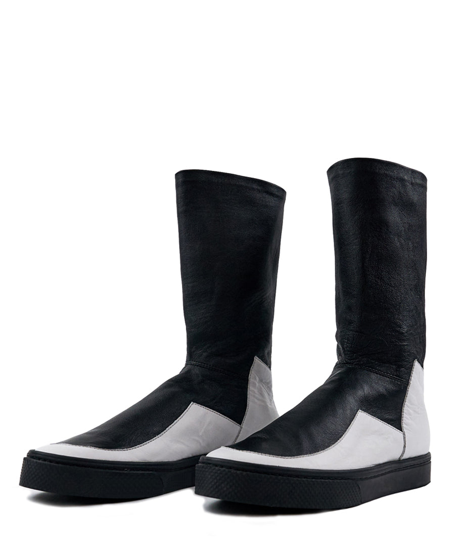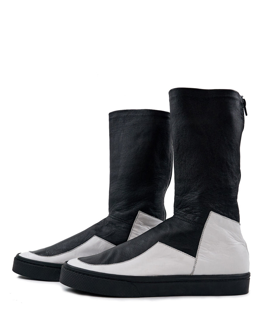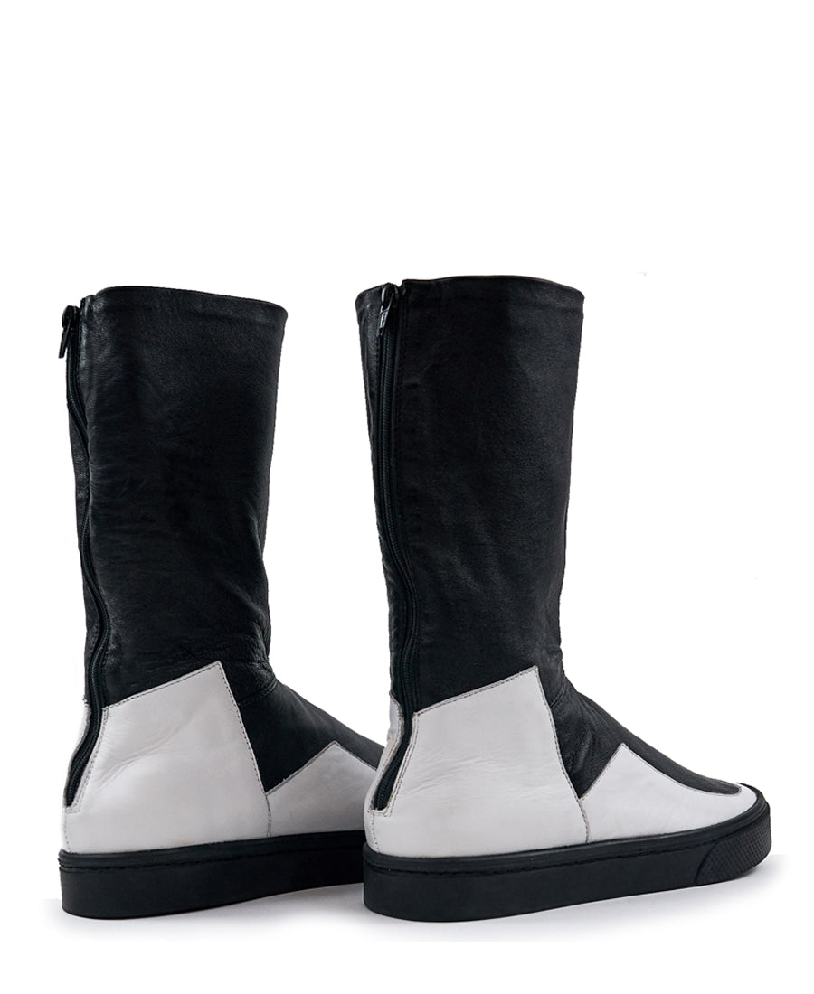 These are hand made Boots of Genuine Leather. The base of the boot is made of white Cow leather and the upper part and lining is made of black Lamb leather, with a black zipper on the back from mid ankle to top. The soles are made of black rubber glued and stitched. These have an Androgynous Style.