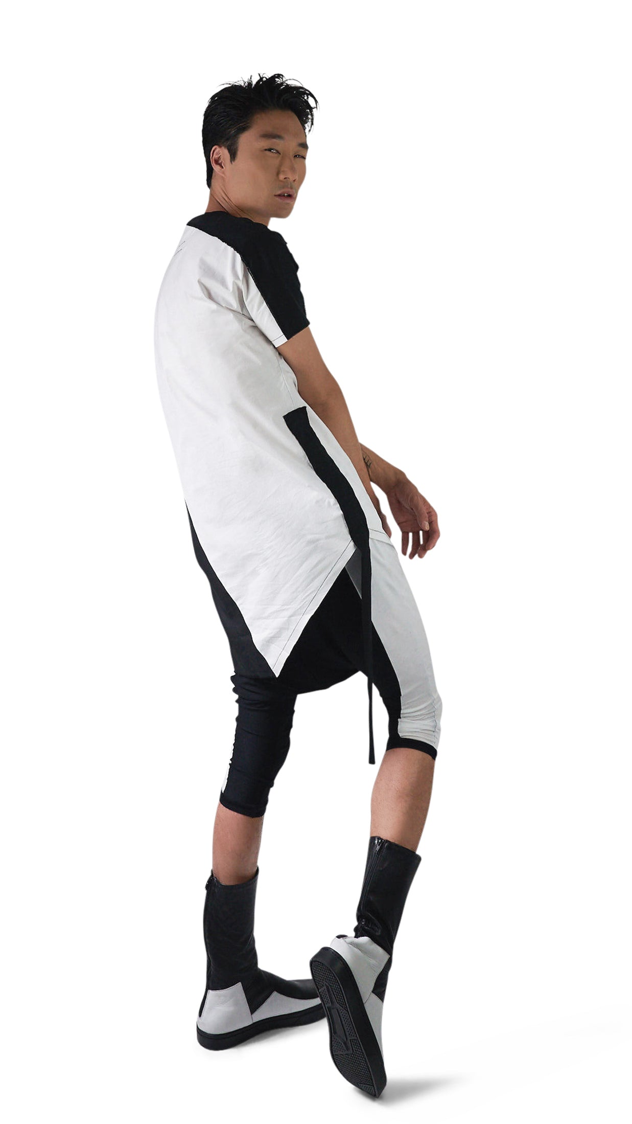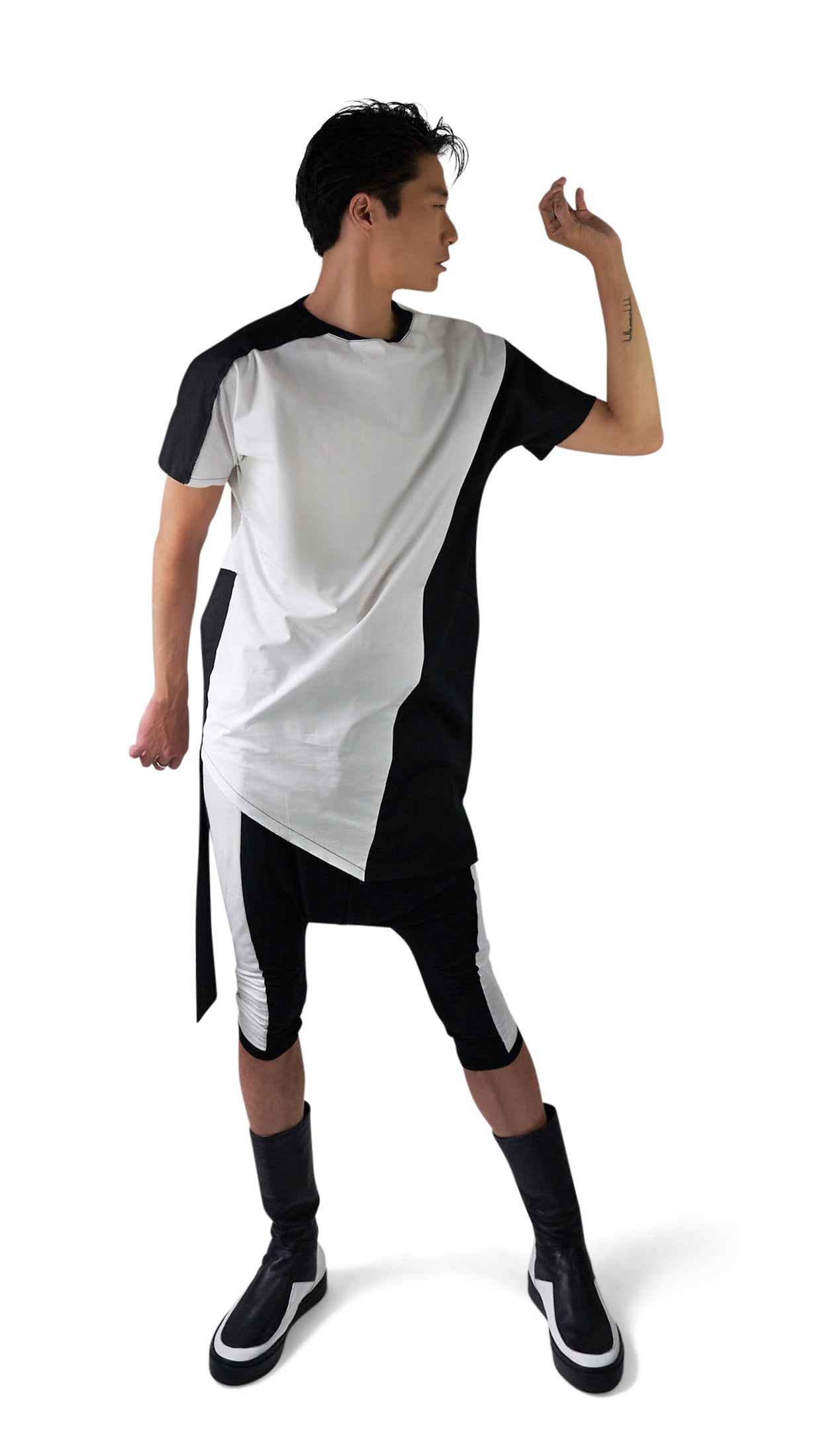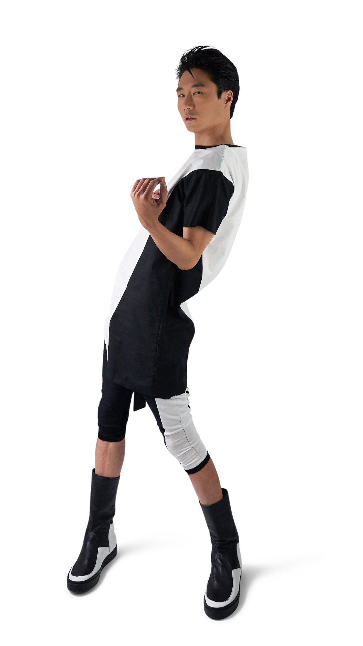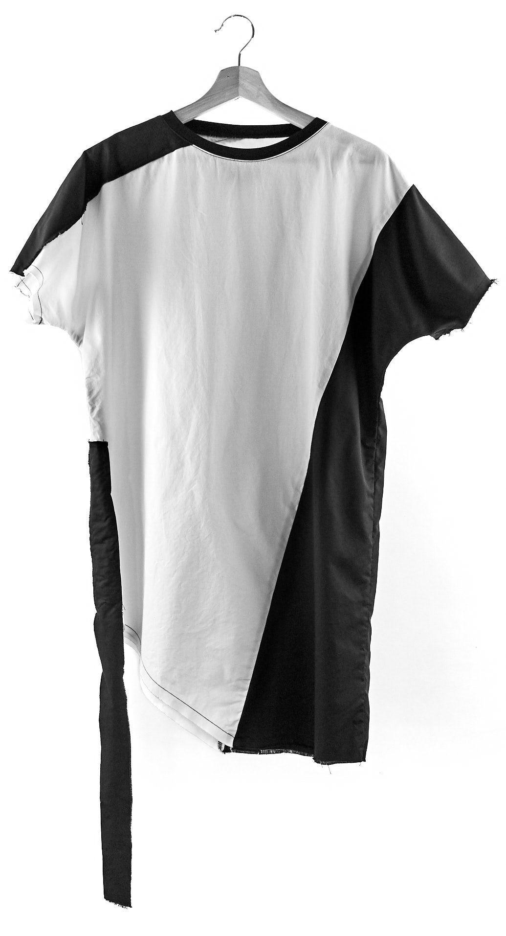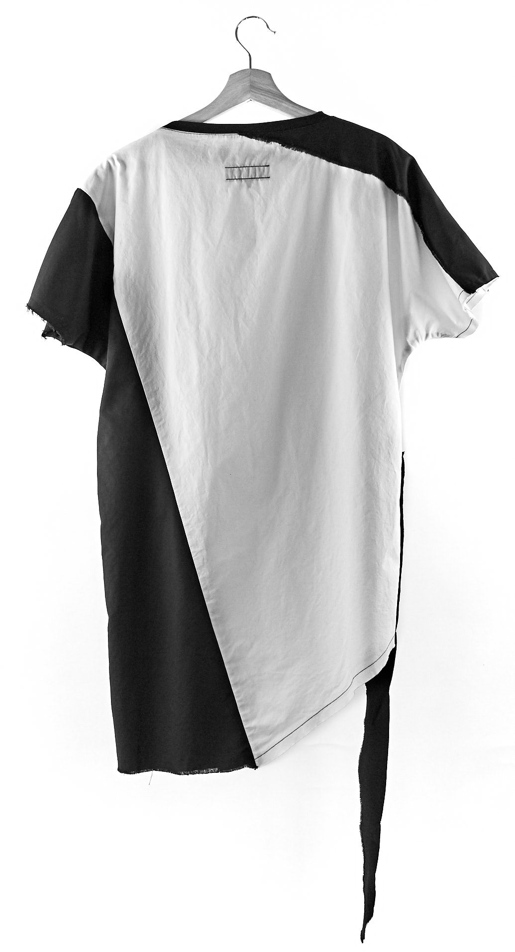 T-shirt made only with natural materials. Main composition is COTTON with neckline detail made of BAMBOO. Asymmetrical cuts, Futuristic look, Raw finishes on both sleeves and hem. Loose fit.