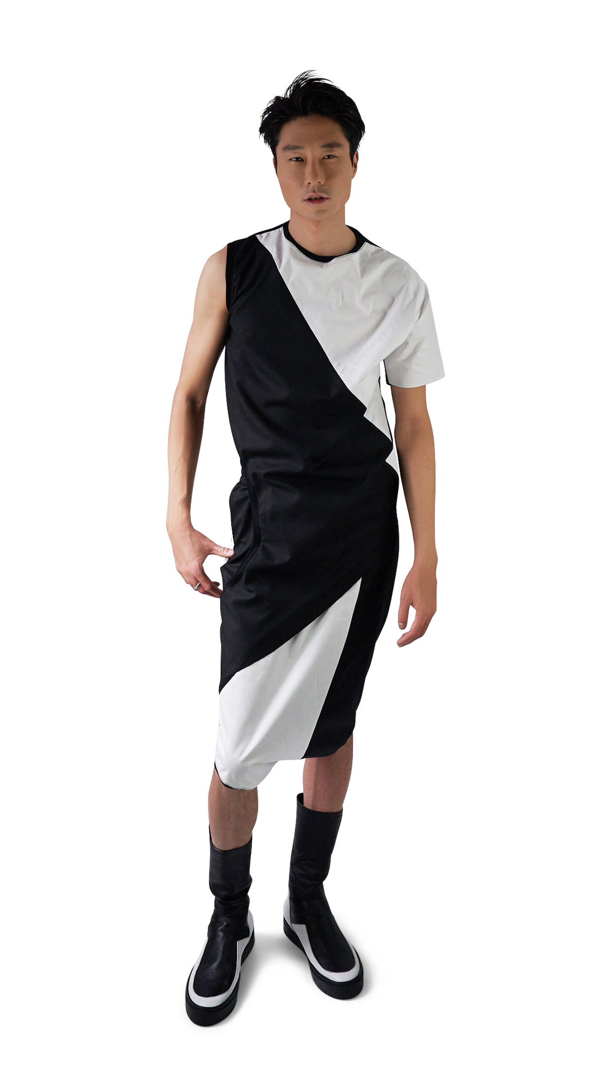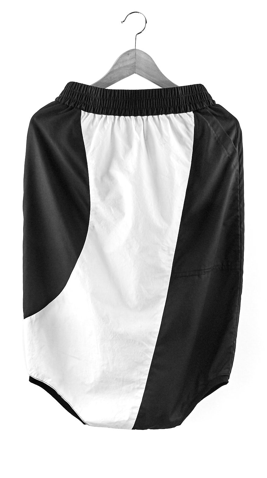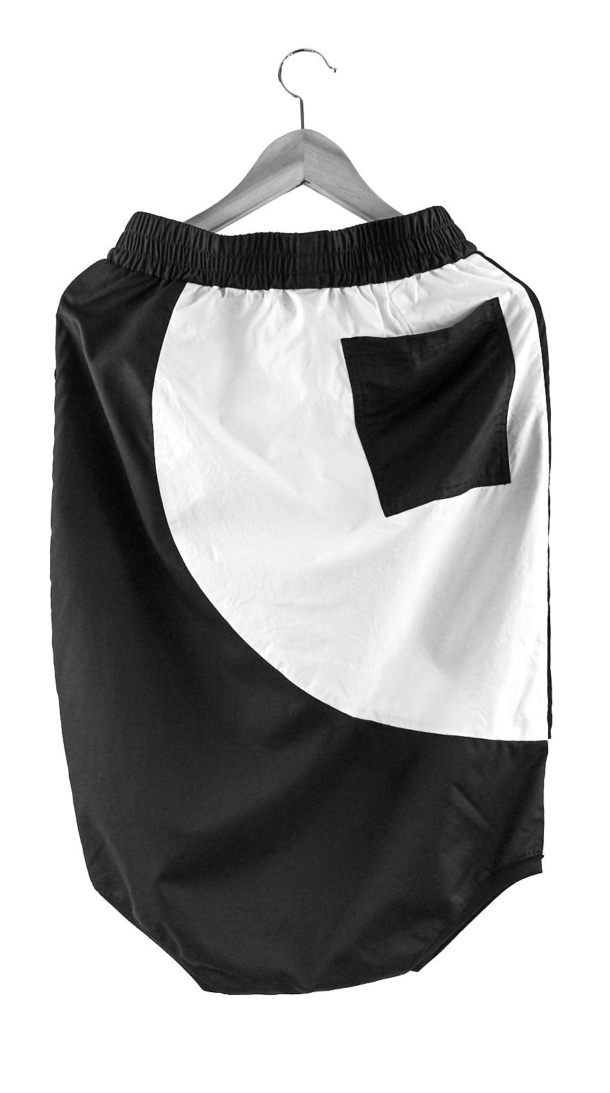 Unisex Shorts with very low crotch made mainly with COTTON. Asymmetrical cuts. Futuristic look, hems made of BAMBOO, Elastic waistband, spacious front pocket which blends into the asymmetrical seam across, also a back pocket with opposite color.