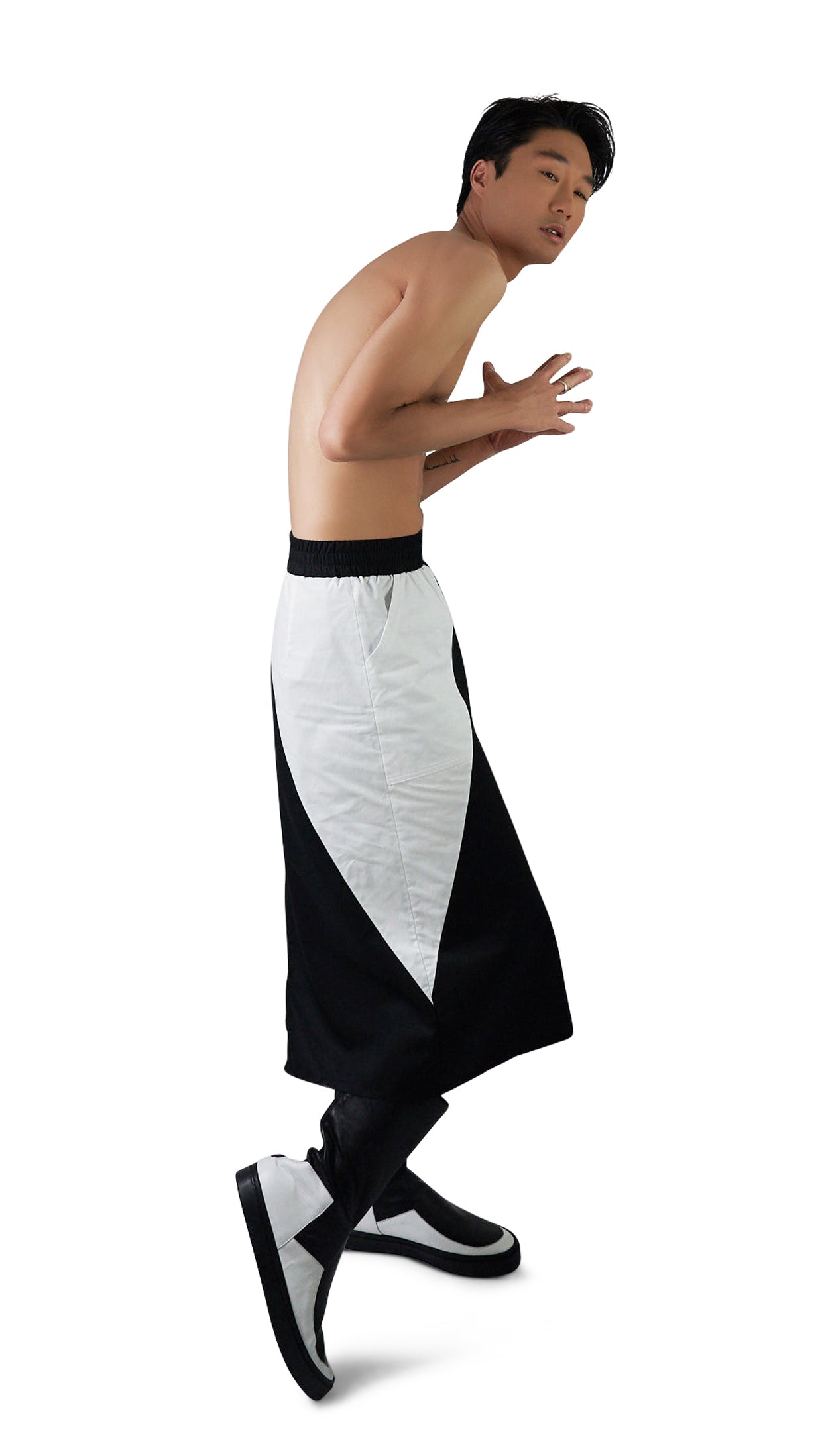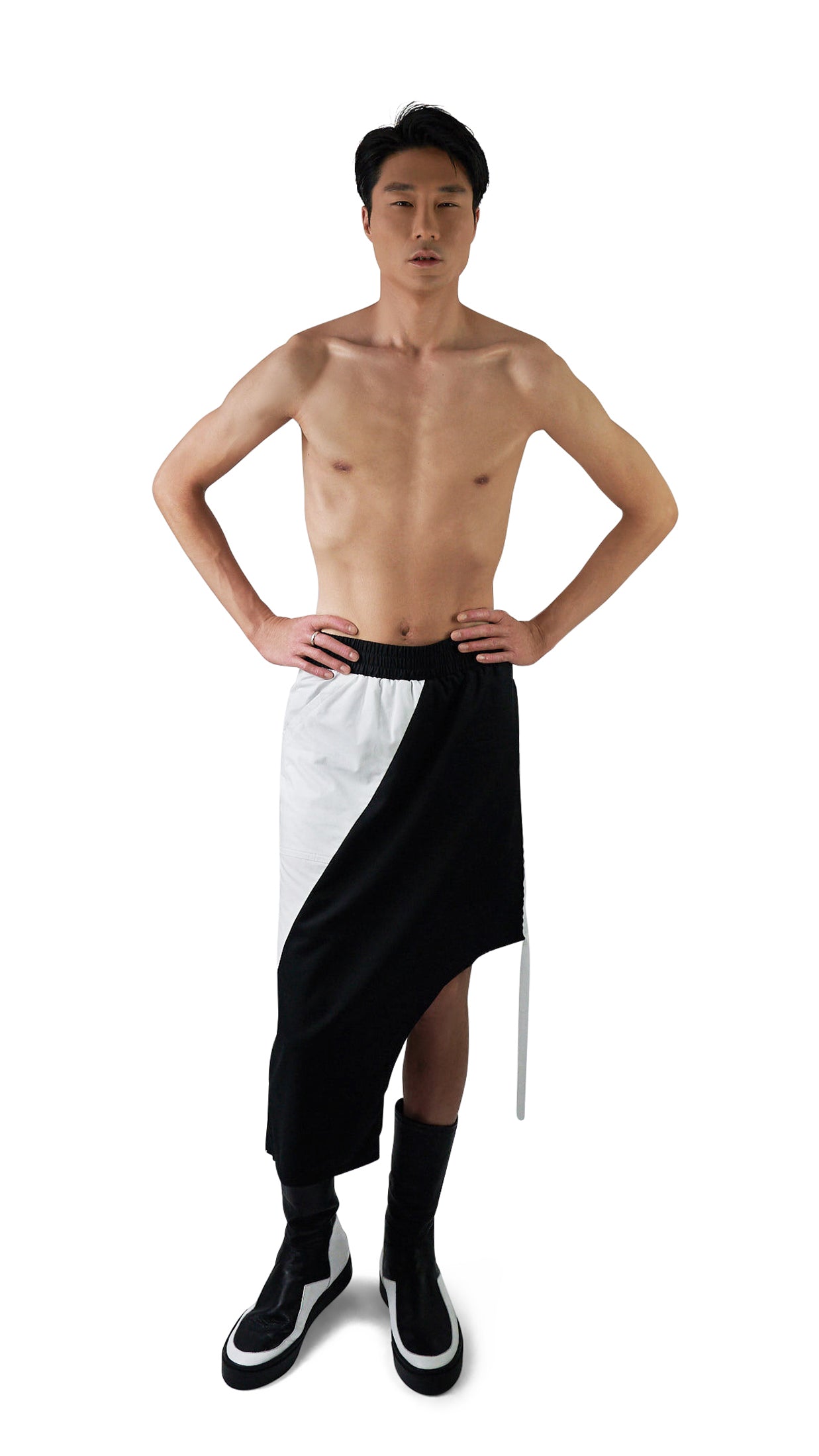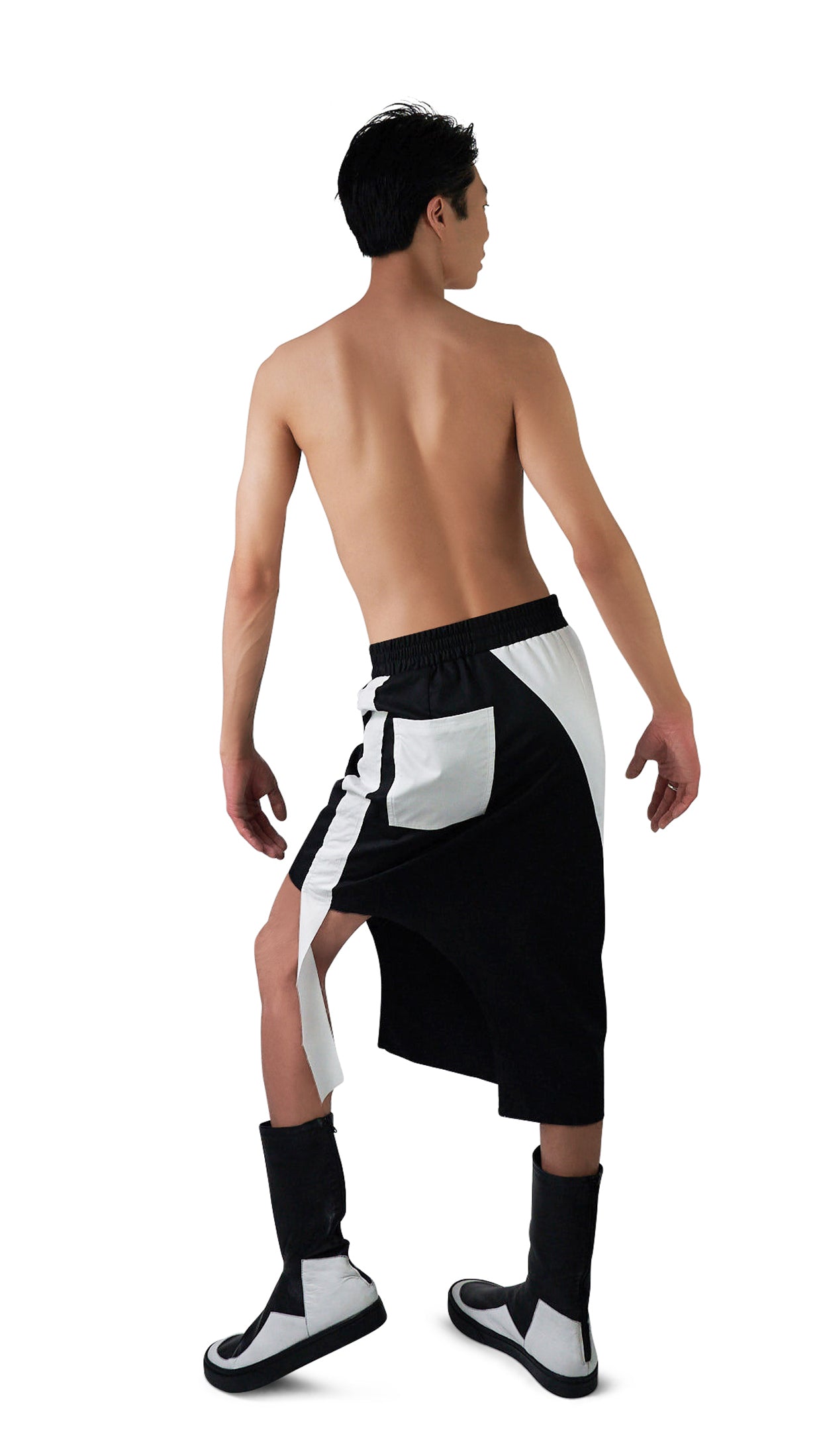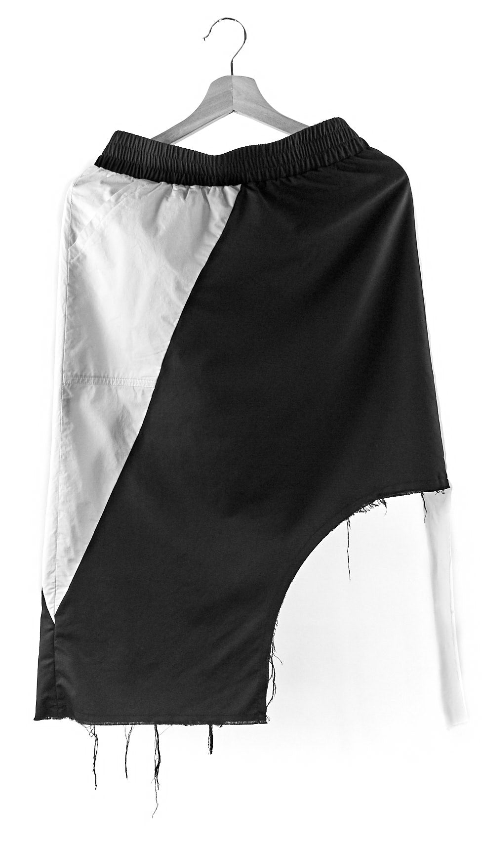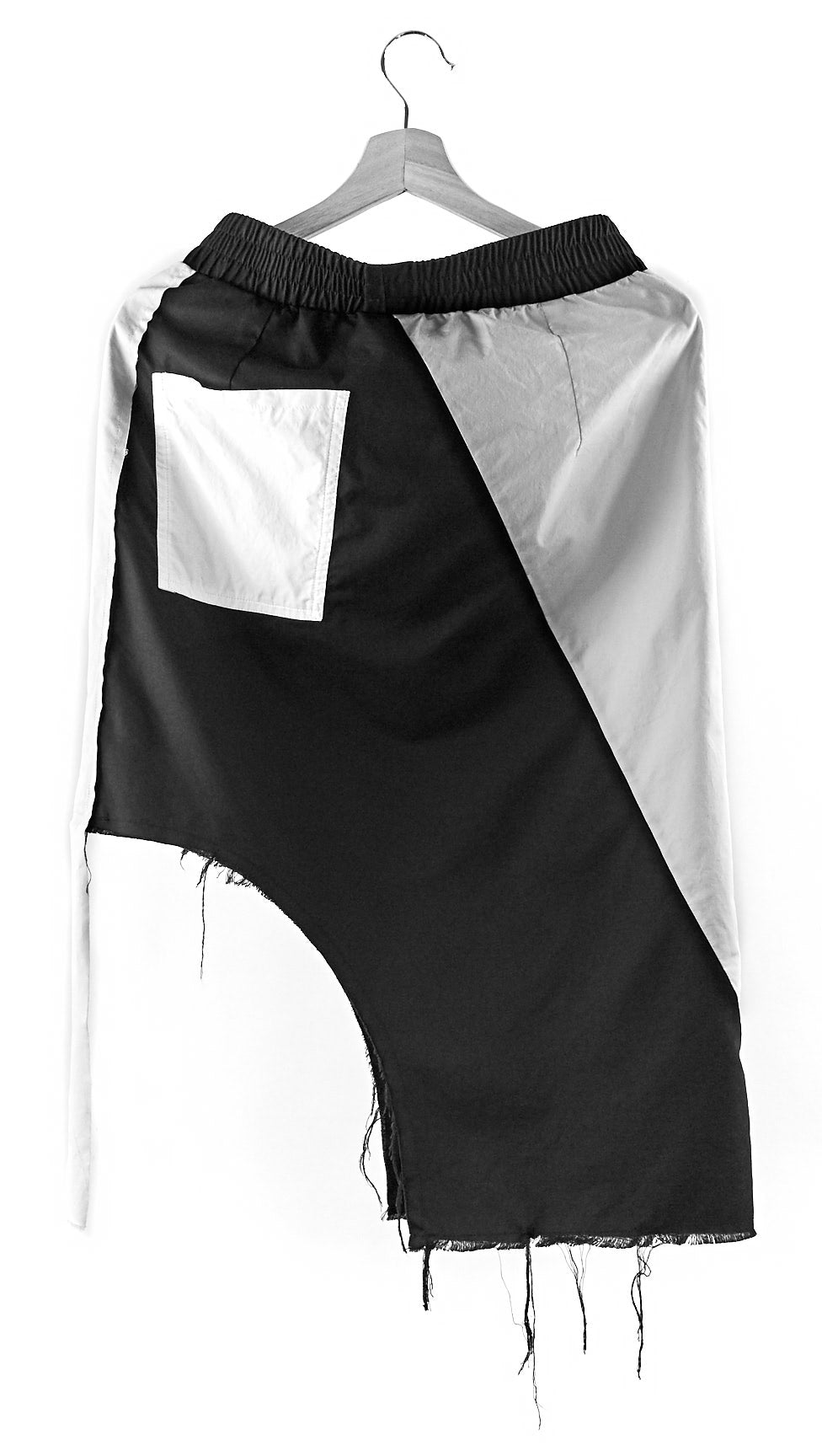 Unisex Skirt made with 100% COTTON. Asymmetrical cuts, Futuristic look, Raw hem, Elastic waistband, spacious front pocket which blends into the asymmetrical seam across. Also a back pocket with opposite color. It features an extension piece of cotton with raw finishes along the side seam which gives a very unique Avant Garde look.