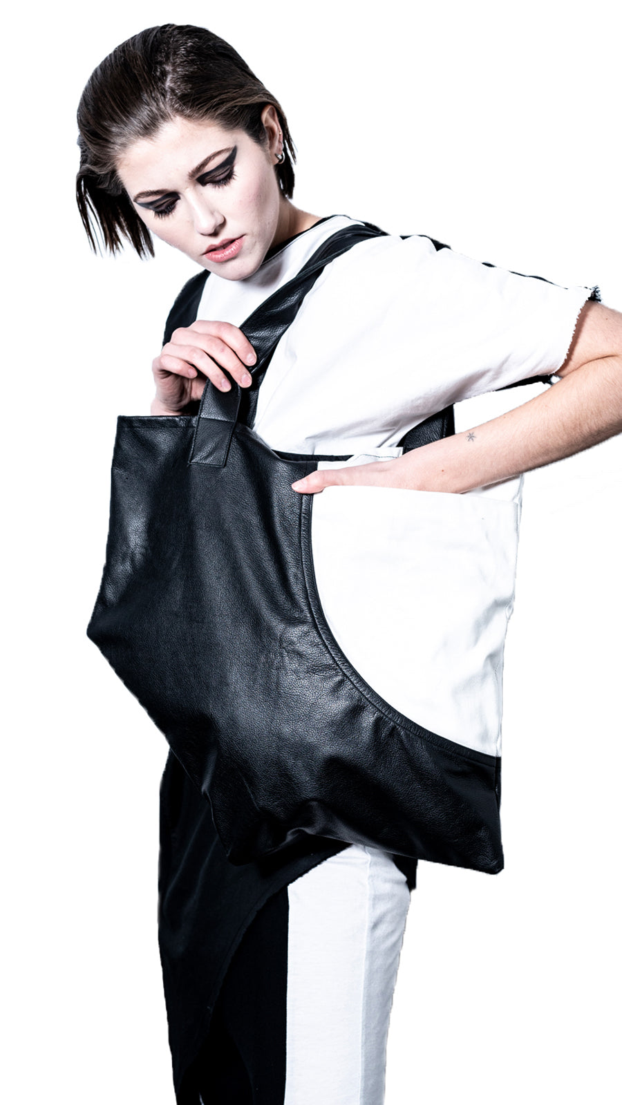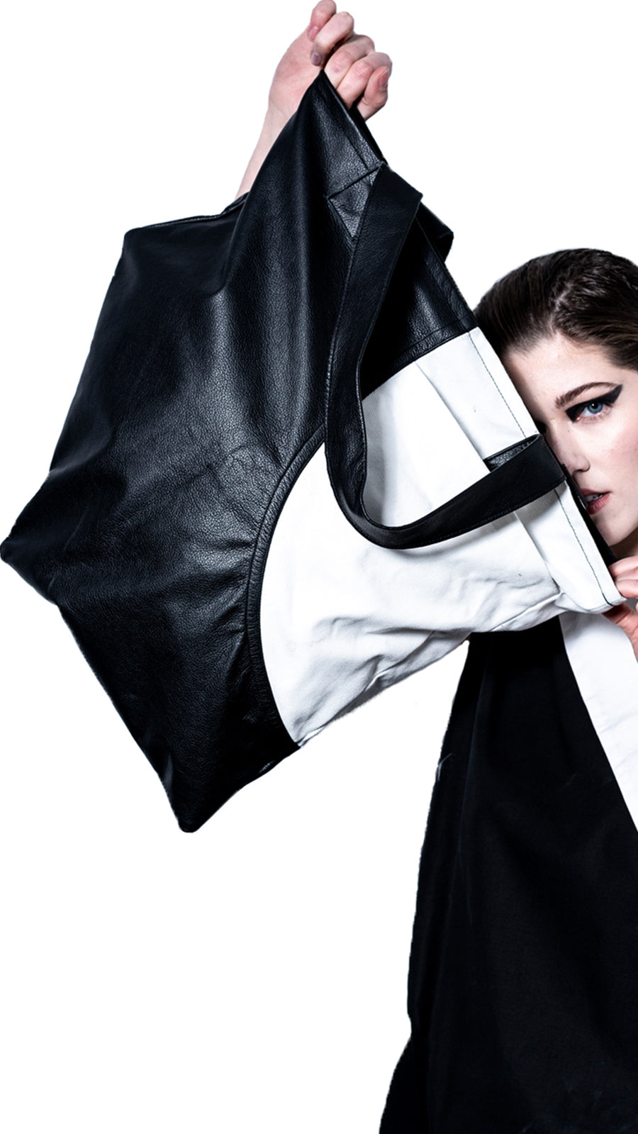 This Geometrical, Asymmetrical TOTE BAG is made of genuine black and white LEATHER. This is a hand strap style bag. It features an outside pocket which blends into the seam across the bag. The lining is made of black COTTON. The handles are made of black LEATHER.