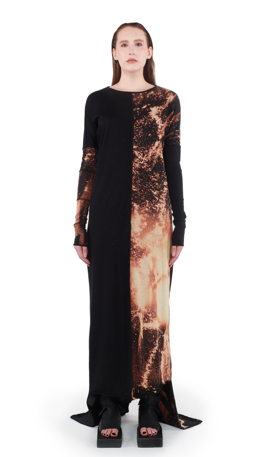 Elevate your fashion game with our avant-garde dress crafted from premium cotton. The hallmark of this garment is the meticulously handcrafted, bleach-treated fabric, carefully curated in our studio. The result is a one of a kind masterpiece that embodies the spirit of change and innovation.