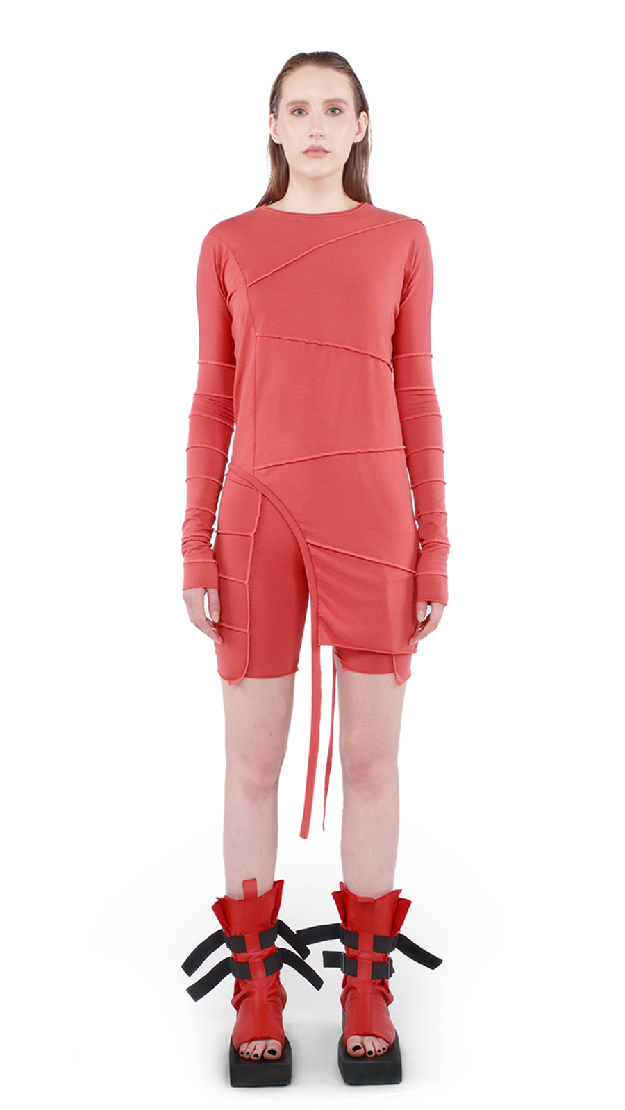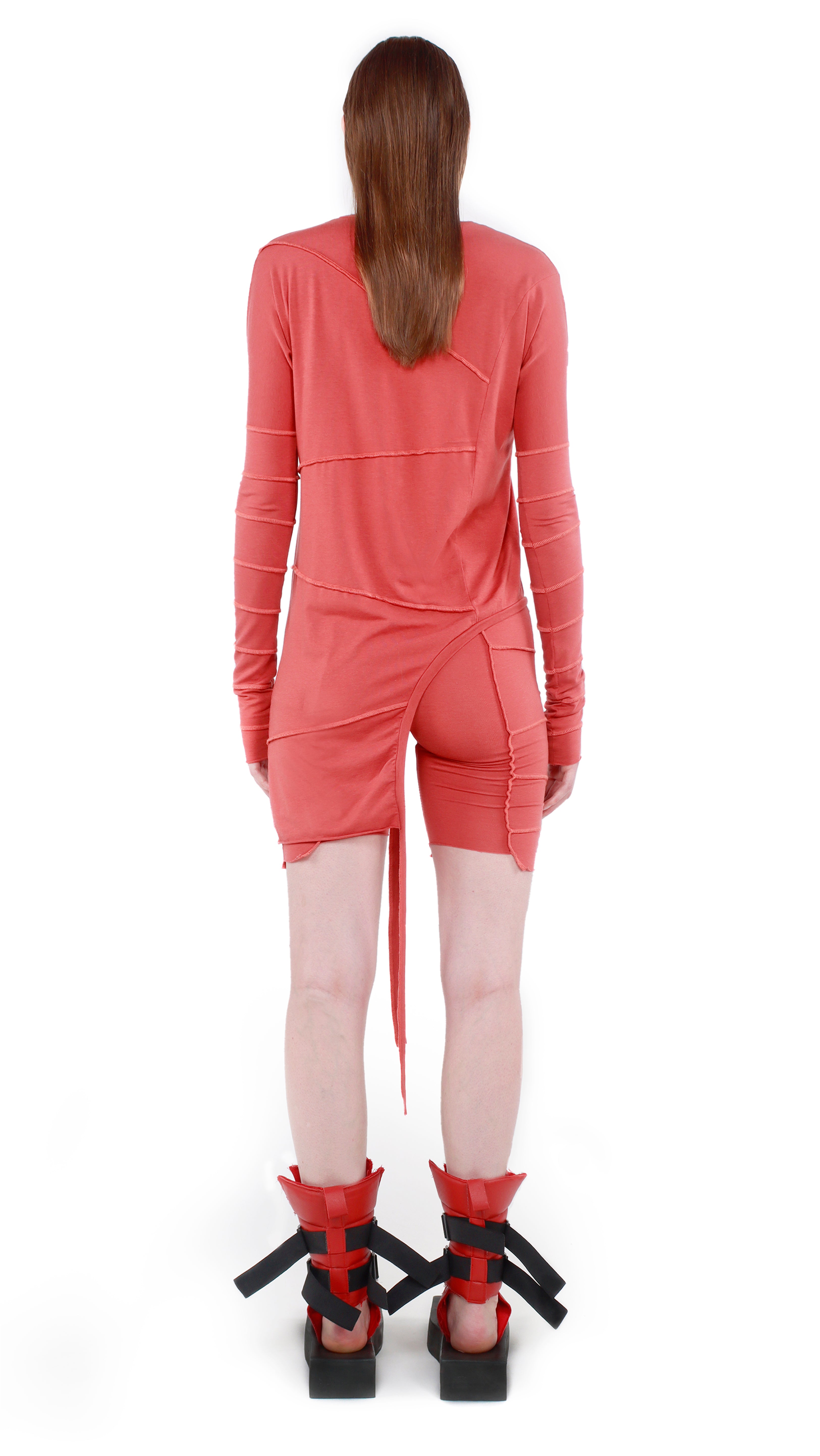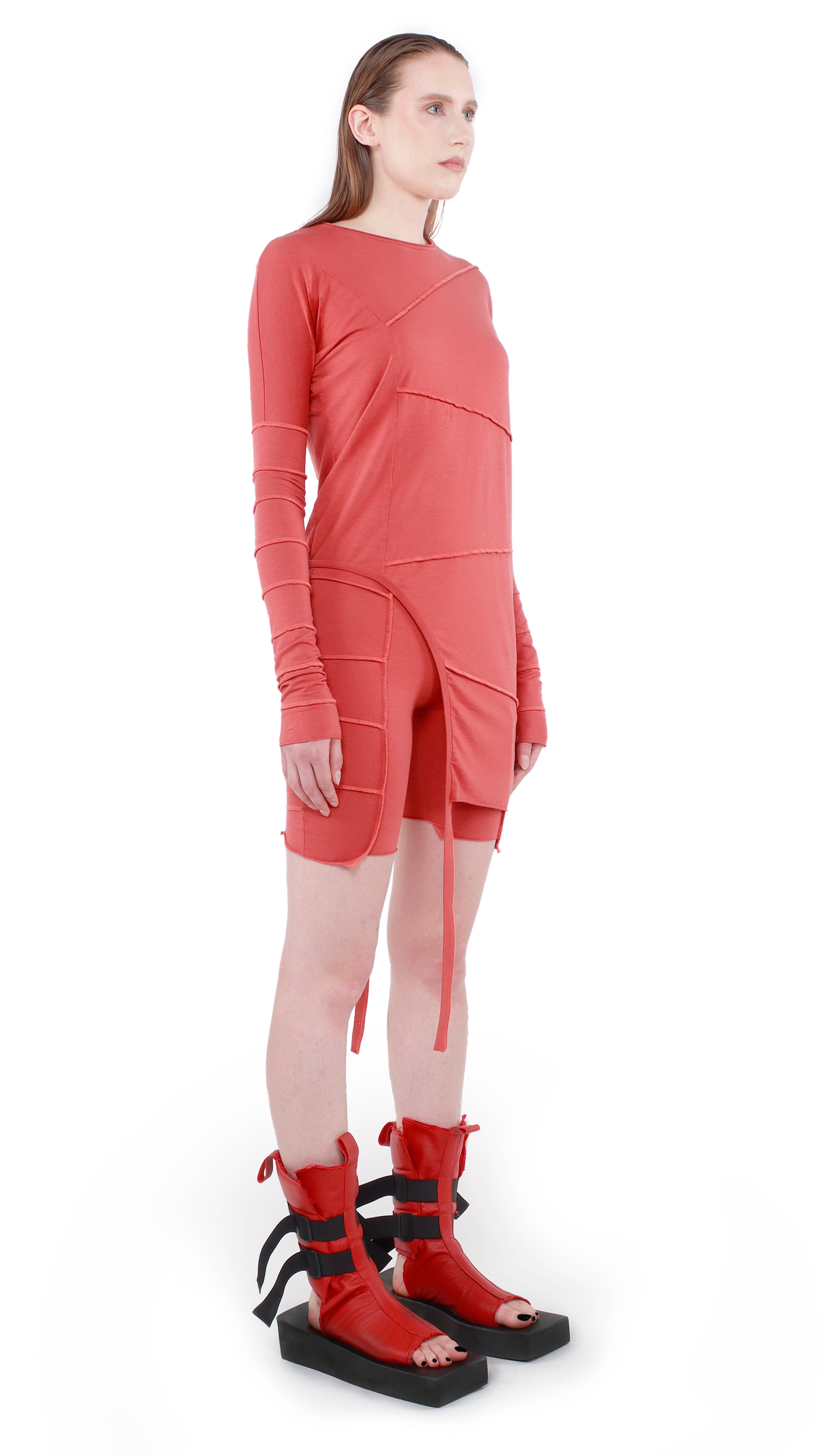 This unique top is gender neutral and 100% handmade . It has full sleeves, with a round neckline. The cool feature of this Avant-Garde design is the upside down seams on the front, back and arms of the garment. The top has an asymmetrical look with the right side of the top reaching your hip and the left side reaching your mid tight. The hems have different levels of cuts with raw finishes.