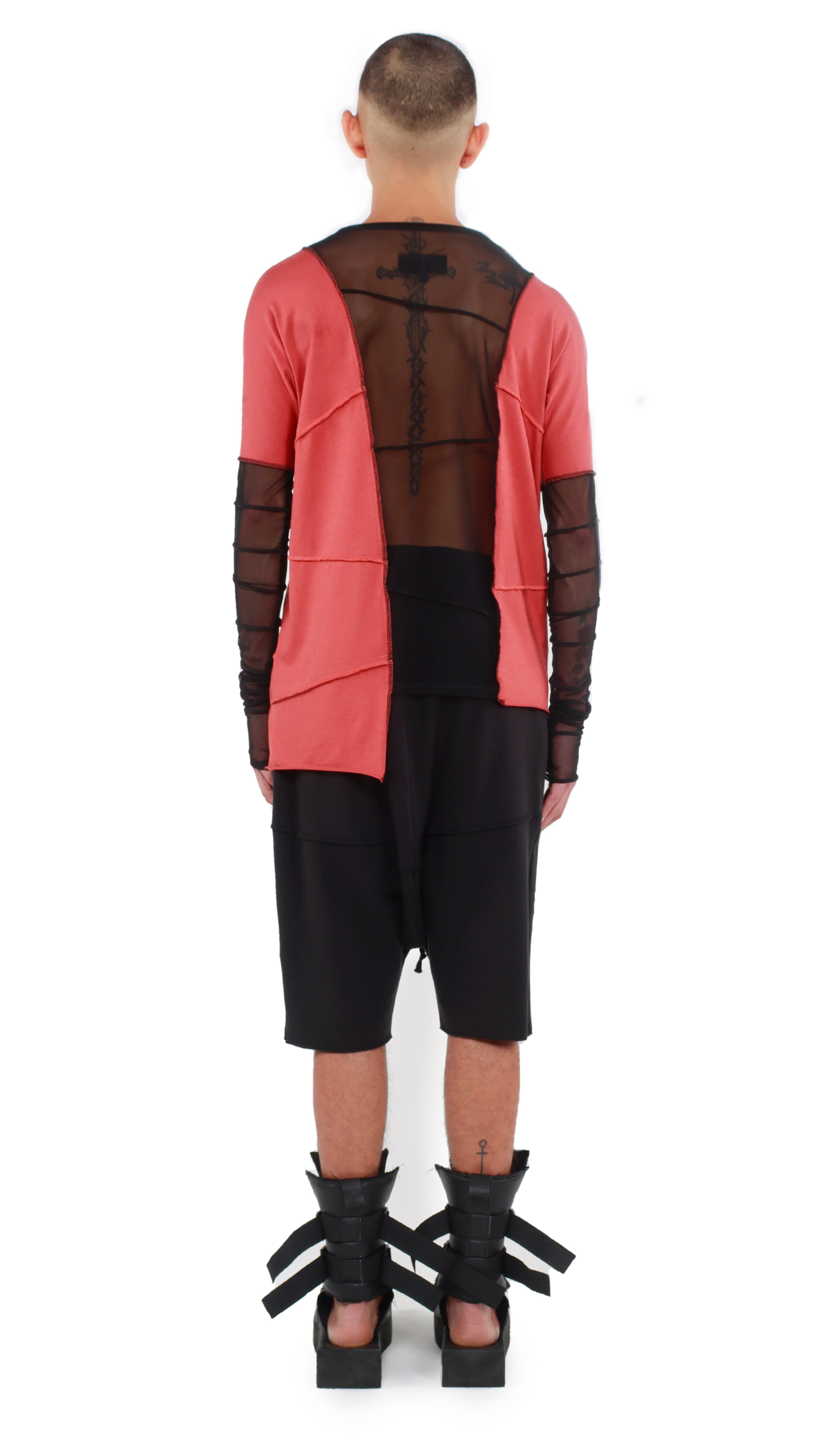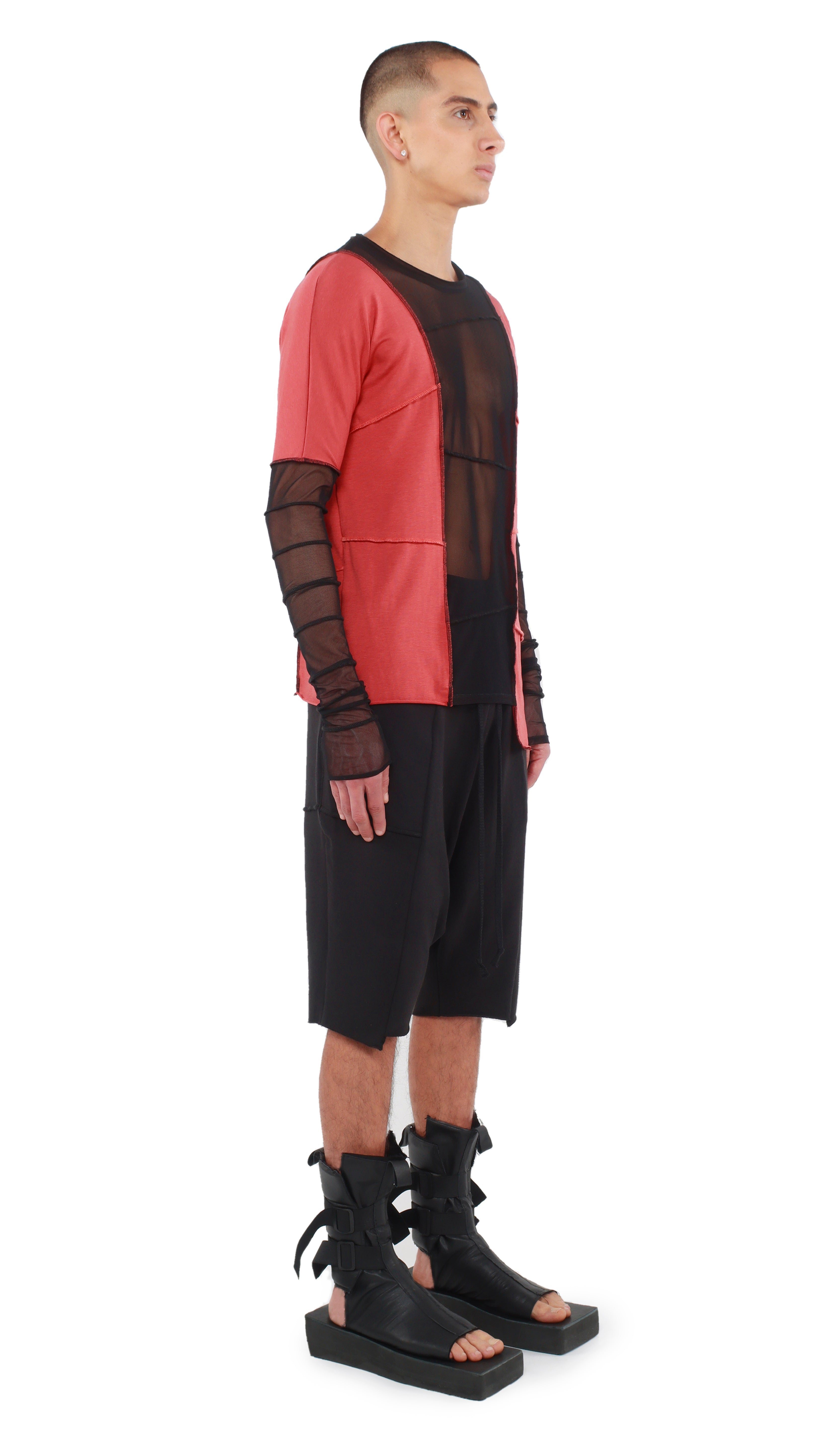 This long sleeve T-SHIRT is 100% handcrafted and made from durable and high-quality fabric. It has a round neckline, rough finishes across the fabric from top to bottom on the front and back for a more Avant-Garde style. The unique feature of this design is the see-through mesh on the front and back of the shirt and the mesh sleeves that have horizontal upside down seams across the arms with raw edges. The combination of the mesh and the fabric gives the t-shirt a unique and rusted look.