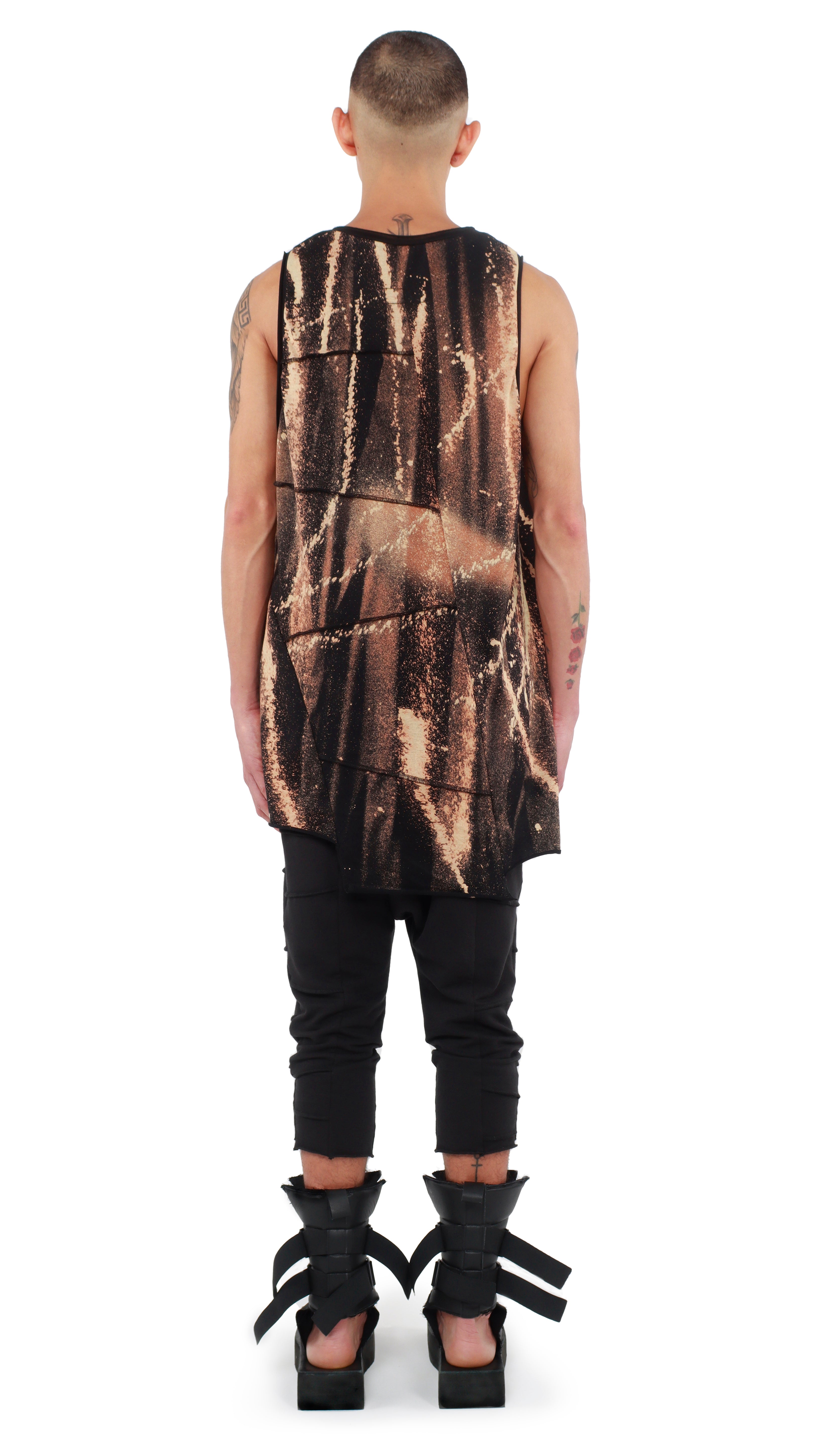 Its design boasts a round neckline and armholes with raw, edgy finishes, creating a distinctive aesthetic. What truly sets this avant-garde piece apart are the asymmetrical upside-down seams gracing both the front and back, pushing the boundaries of conventional design. The hems feature varying levels of cuts with raw finishes, complemented by a hand-made fabric print achieved through meticulous bleach spraying.