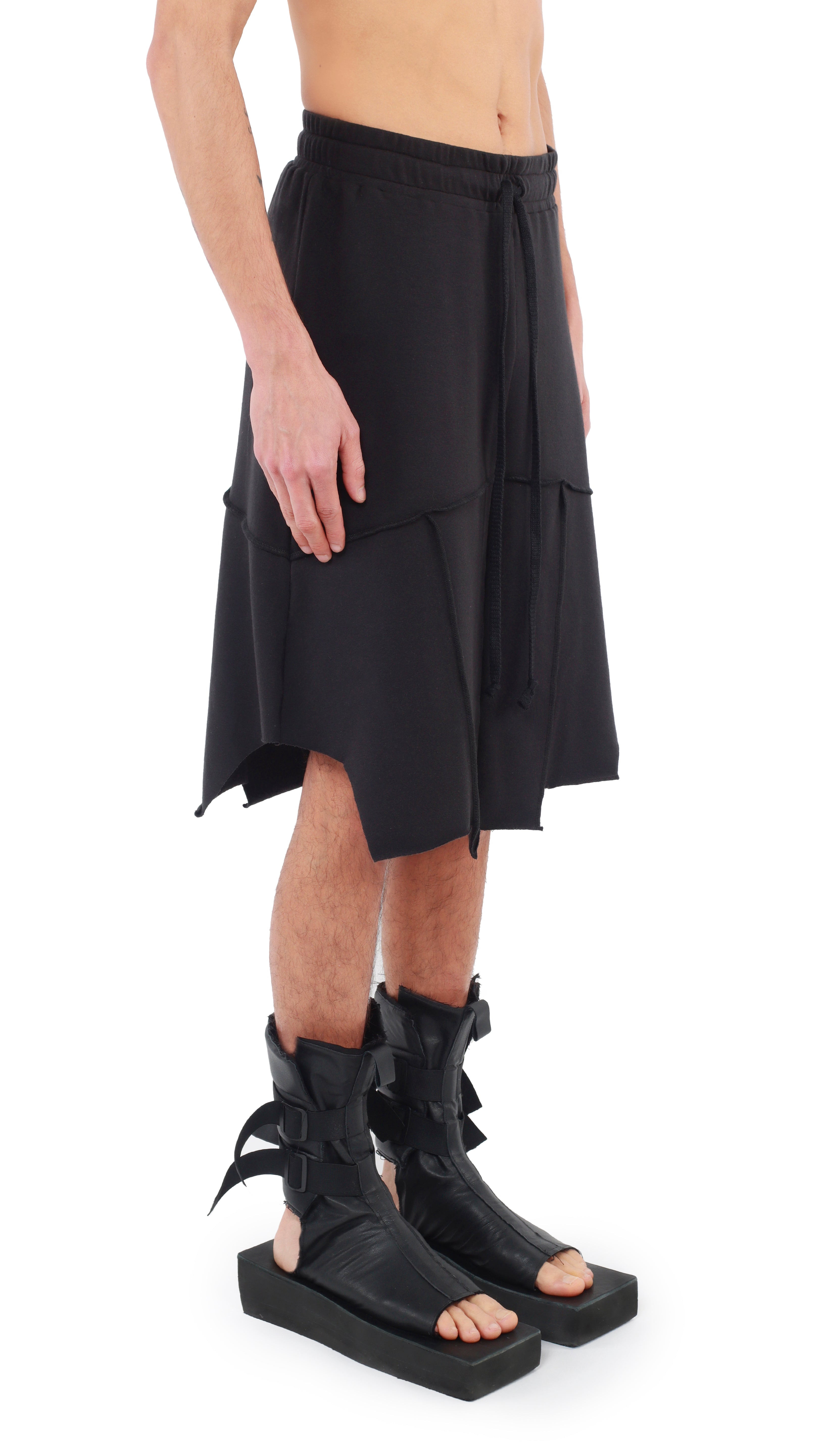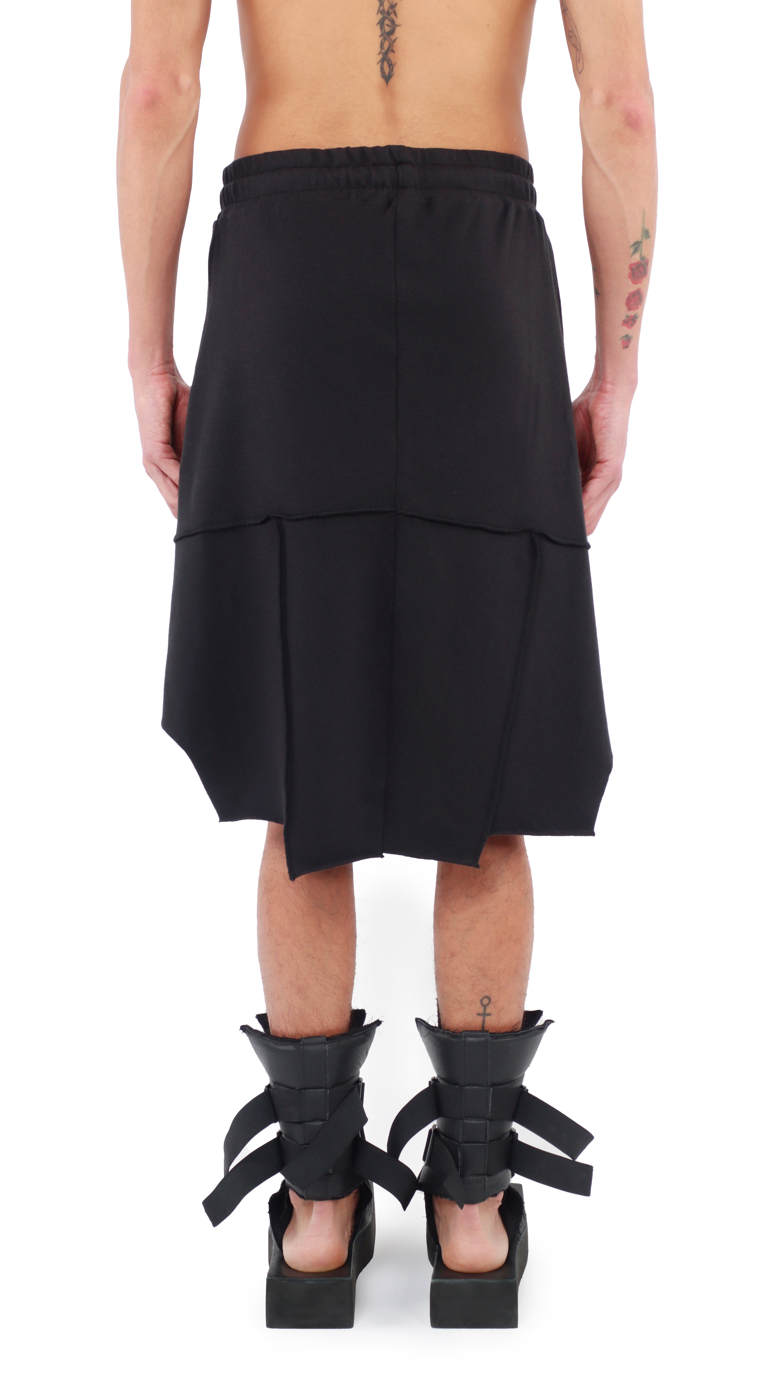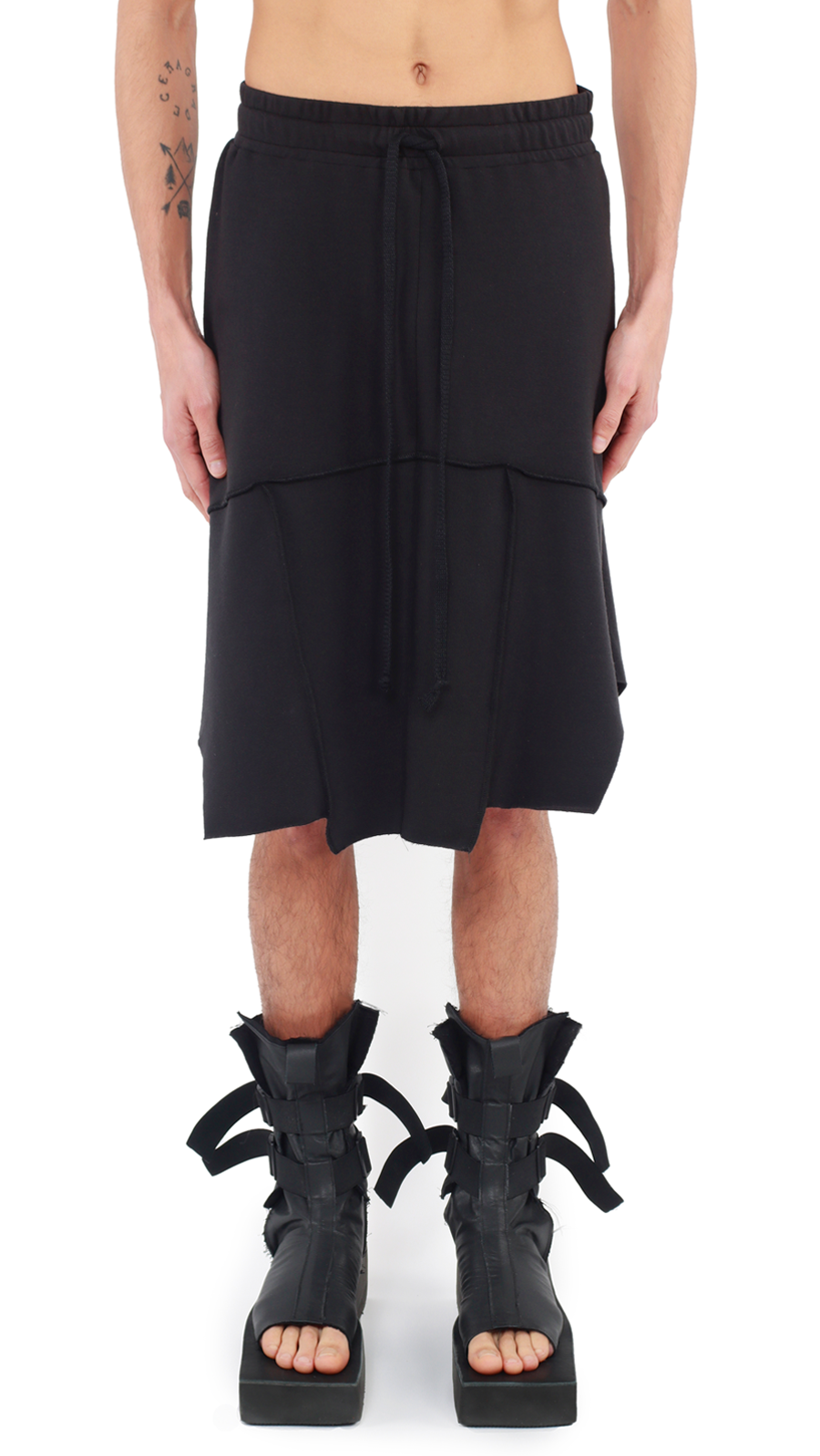 This pocketless skirt is made of super soft, premium materials. It has an elastic waistband which makes it very comfortable to wear, extra long drawstrings for a better fit, asymmetrical side detailed upside down seams in the front and back. The hems have different levels of cuts with raw finishes.