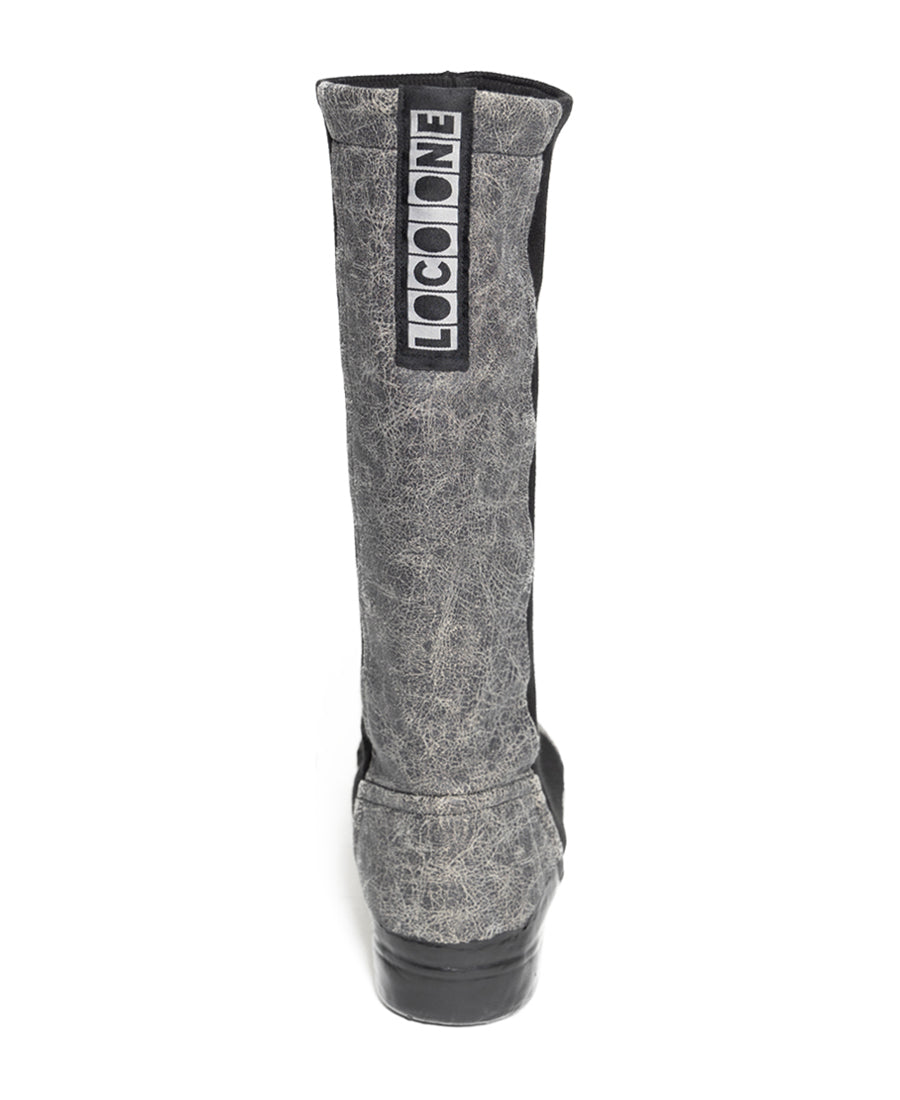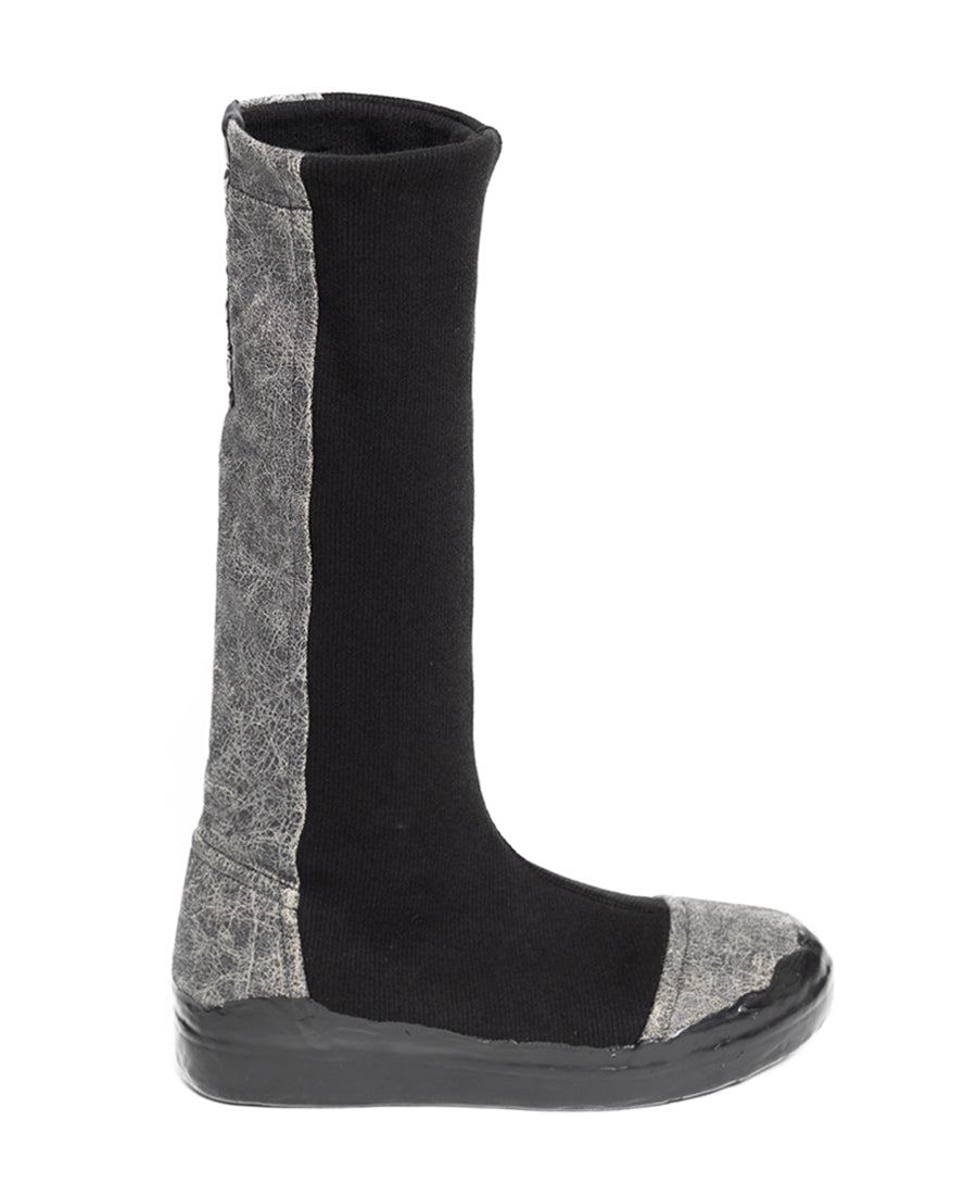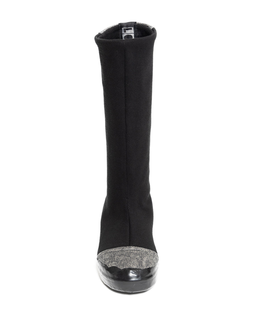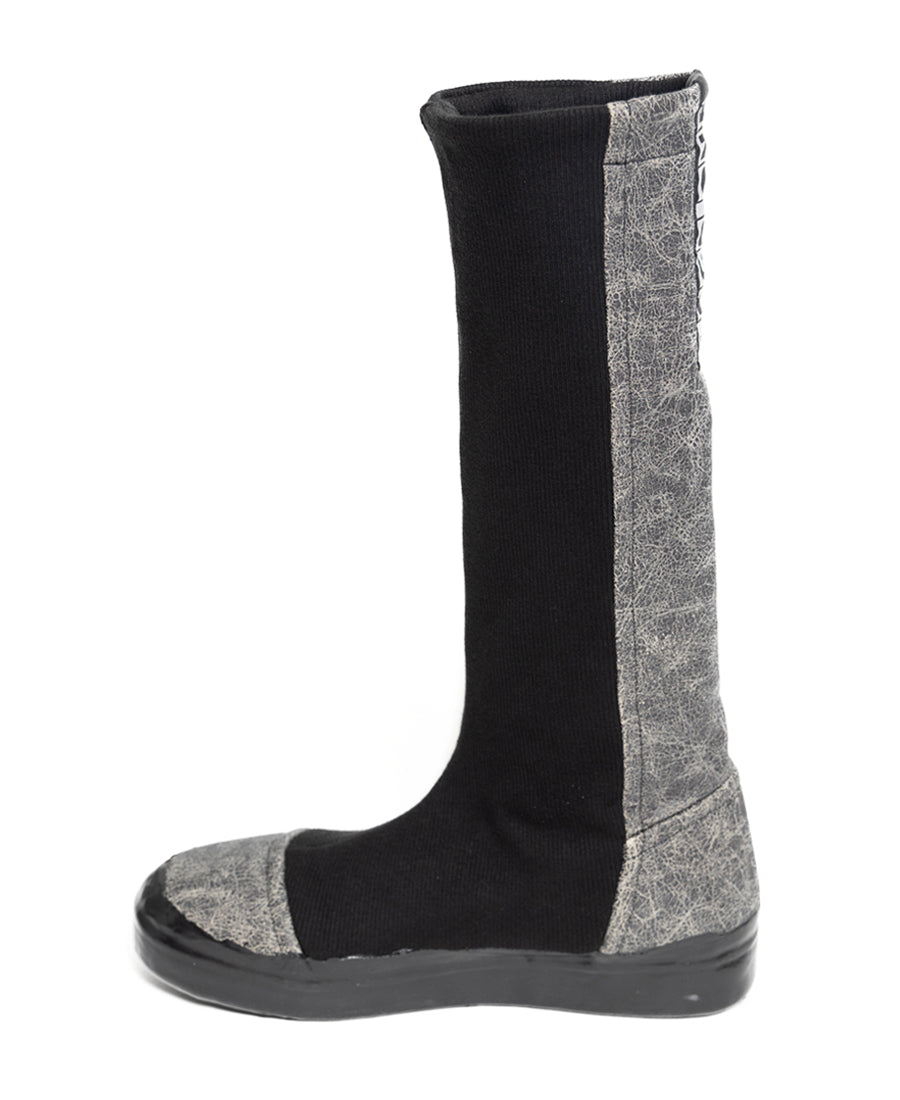 Sock style boots. The upper and lining are made of stretchy rib in black color. The toe cap, the heel counter and all the back side of the boot are reinforced and made of cracked style cotton. The soles are glued and stitched, featuring a coat of rustic finish of black liquid rubber.