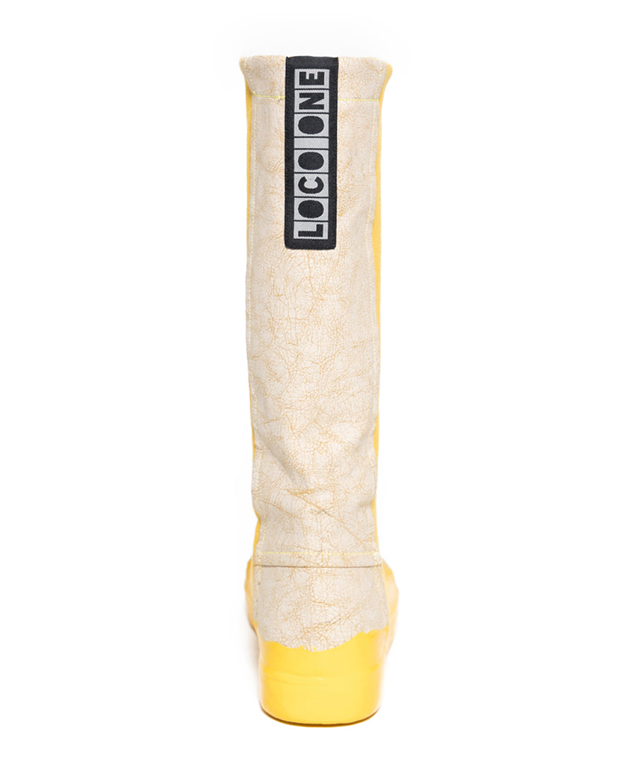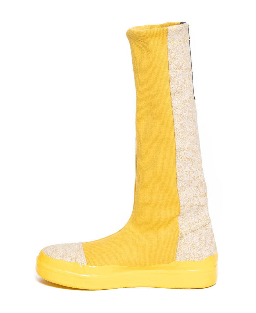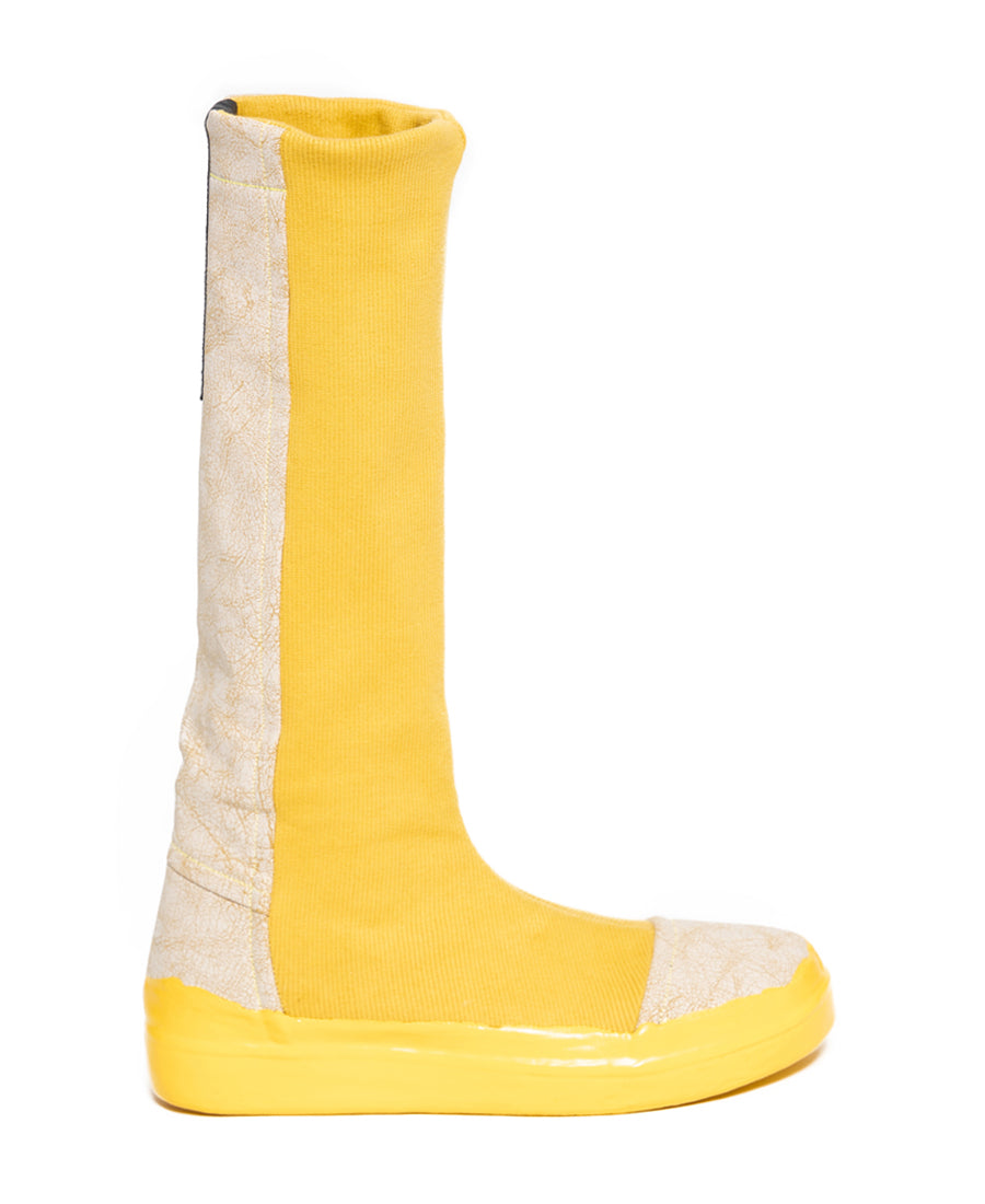 Sock style boots. The upper and lining are made of stretchy rib in yellow color. The toe cap, the heel counter and all the back side of the boot are reinforced and made of cracked style cotton. The soles are glued and stitched, featuring a coat of rustic finish of yellow liquid rubber.