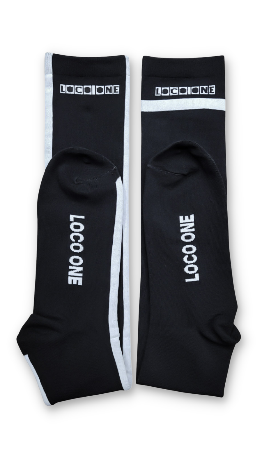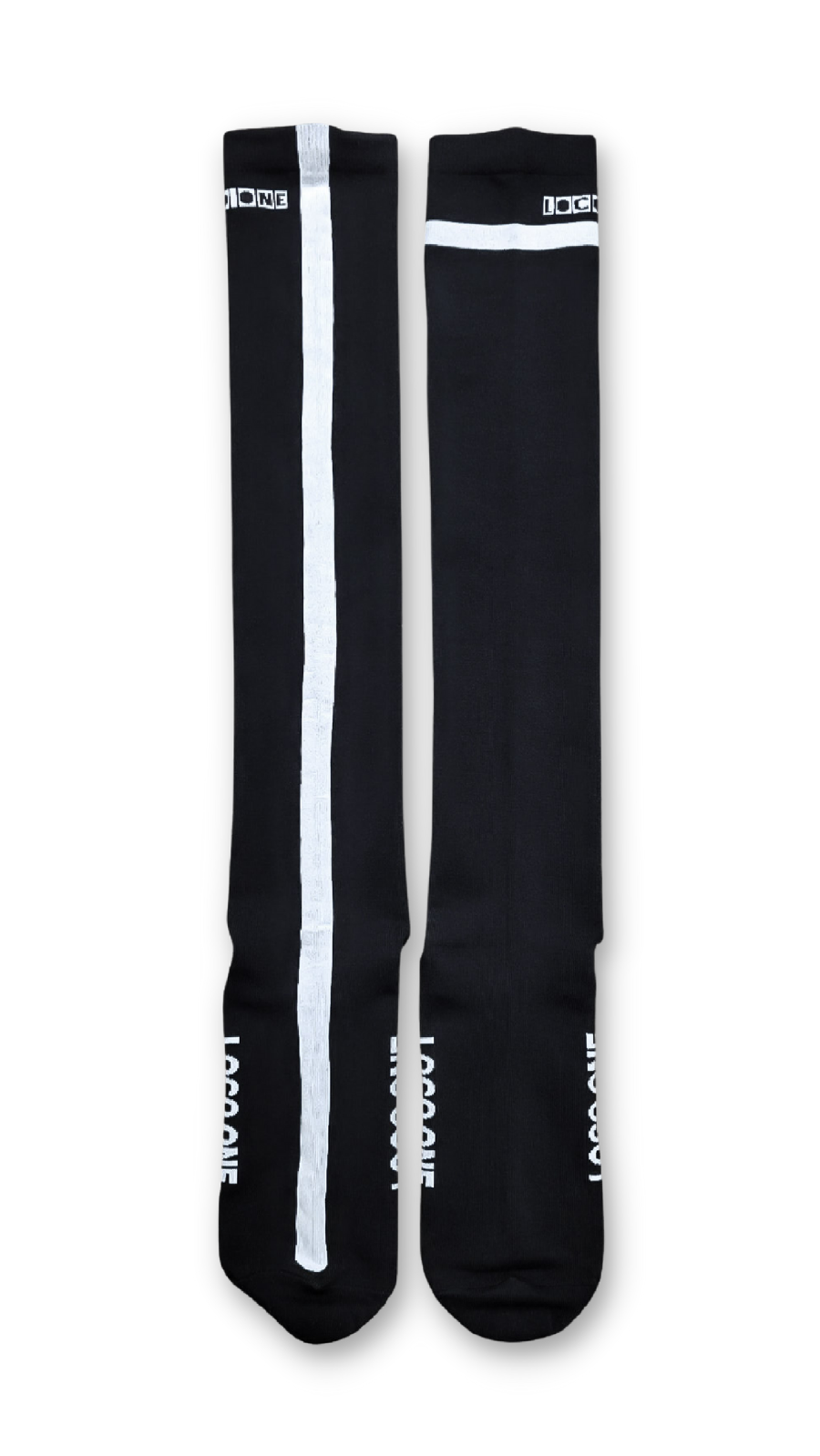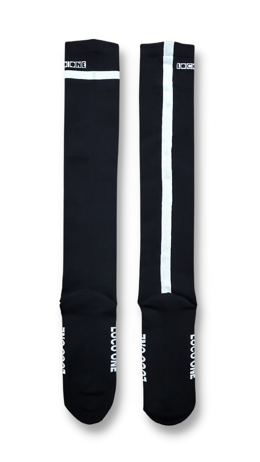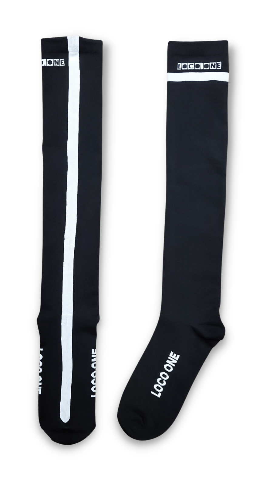 These knee socks redefine conventional fashion with an asymmetrical twist. The right sock boasts a bold white vertical stripe gracing both its front and back, while the left sock takes a unique approach with a horizontal stripe wrapping around. To complete the avant-garde look, each sock proudly showcases the LOCO ONE knitted logo on the top outside and our brand name on the foot base.