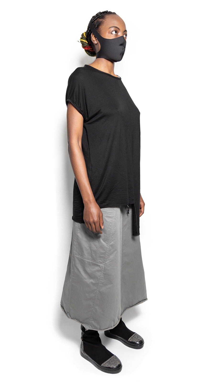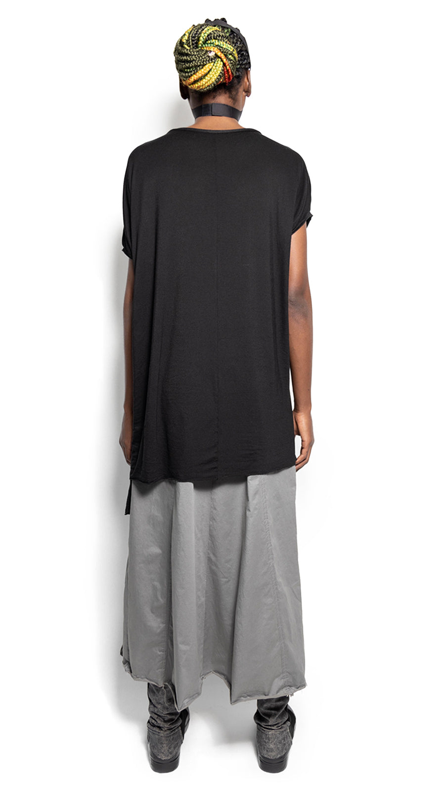This futuristic t-shirt is made of TENCEL which comes from the natural cellulose found in wood pulp (LYOCELL). Top with a long seam across in the front and back. Sleeveless. Raw neckline. This cool t-shirt features asymmetrical and raw hems, with an urban Avant-Garde look.