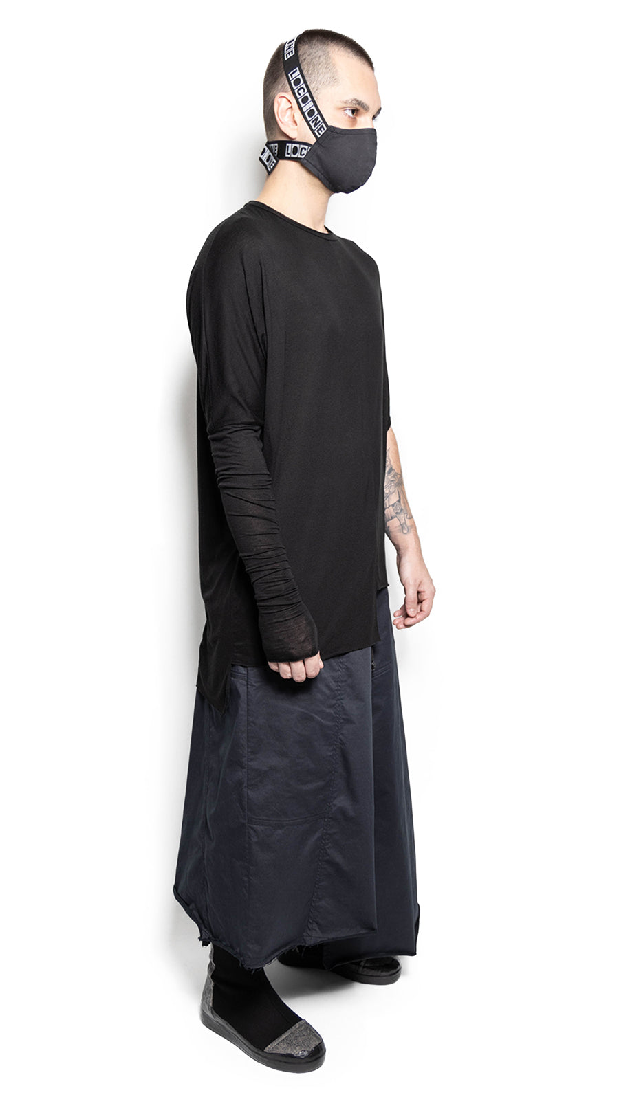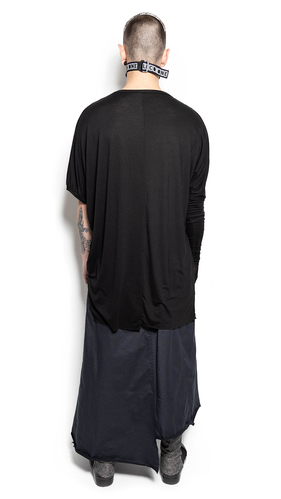 This futuristic t-shirt is made of TENCEL which comes from the natural cellulose found in wood pulp (LYOCELL). Long seam across in the front and back. Left sleeve on an angle following the silhouette of the garment. The feature of this cool t-shirt is the asymmetrical and raw hems and the right extra long sleeve which gives you that urban Avant-Garde look.
