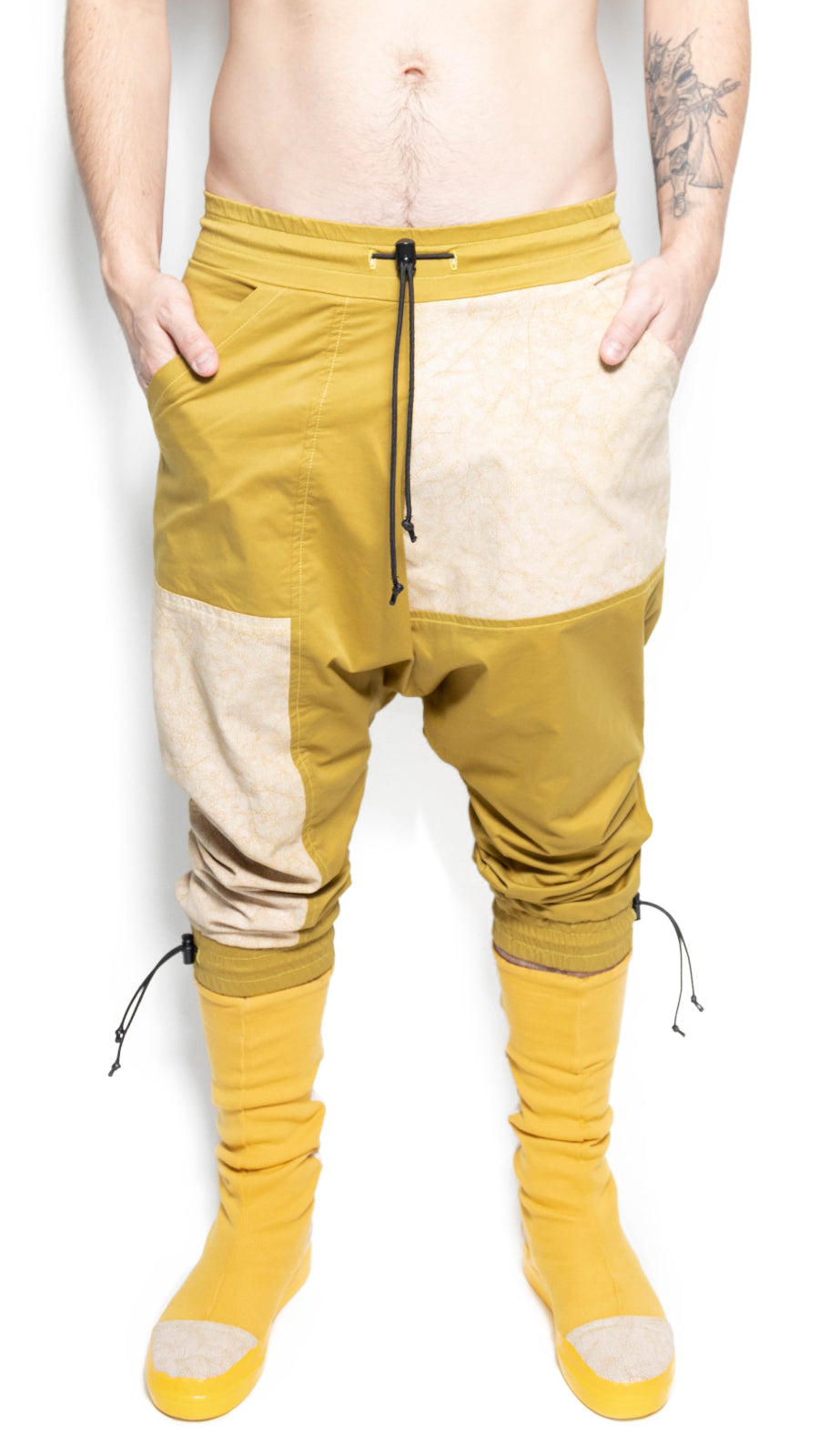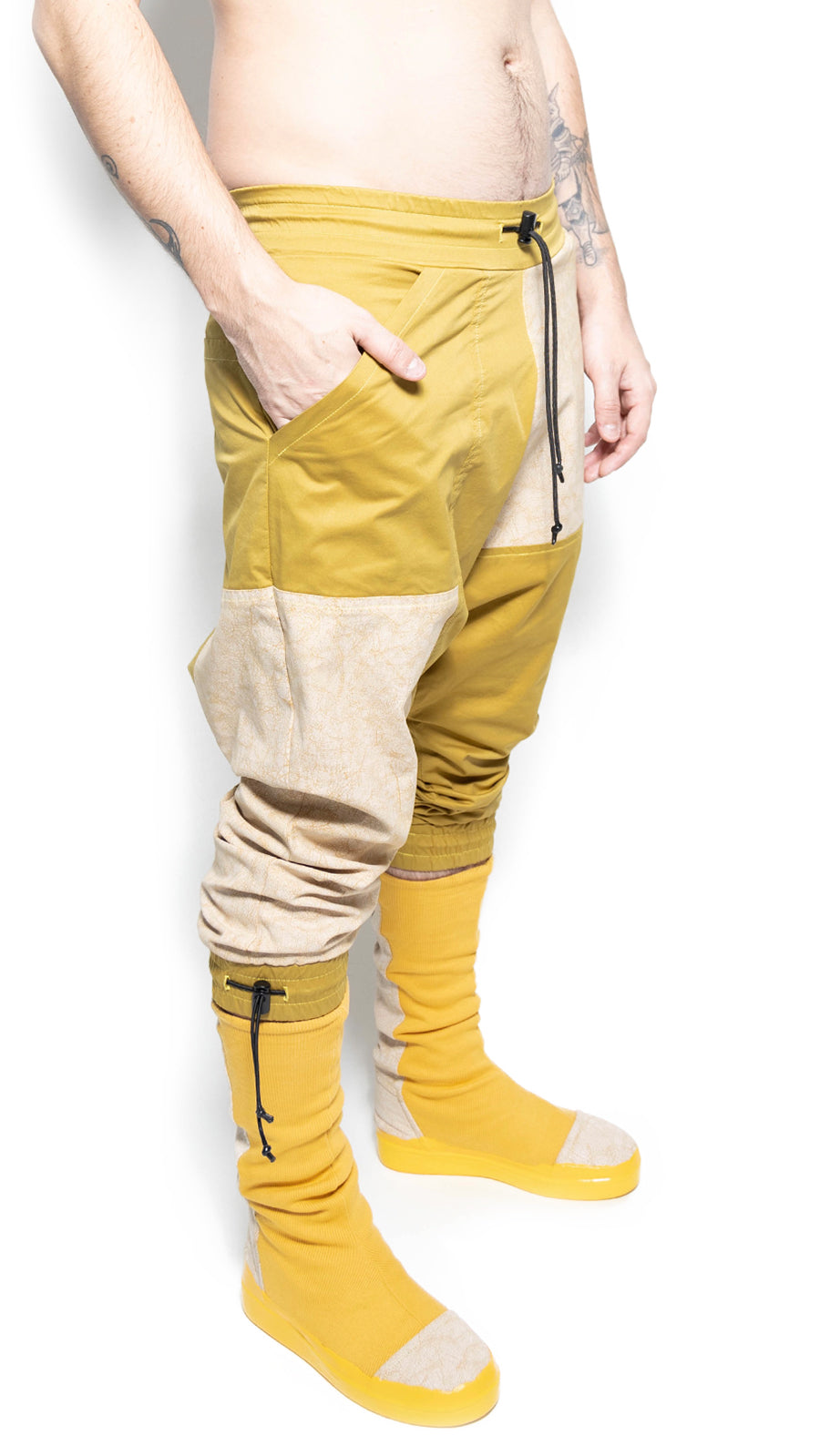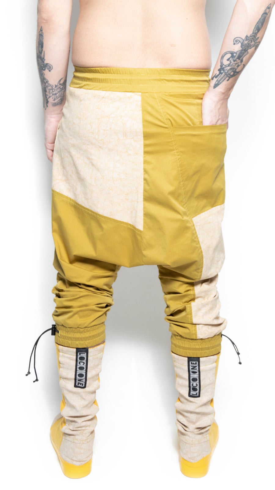 The main composition of these cargo GENDERLESS Trousers is COTTON. Details in the front and back of are made of cracked style COTTON Asymmetrical detailed seams along the length of the pants. Futuristic look. Drawstring waist with the tips deepen in liquid RUBBER as a detail. Huge two front pockets, and one back pocket. Elastic hems with adjustable laces with tips also deepen in liquid RUBBER. Low crotch. Oversized fit.