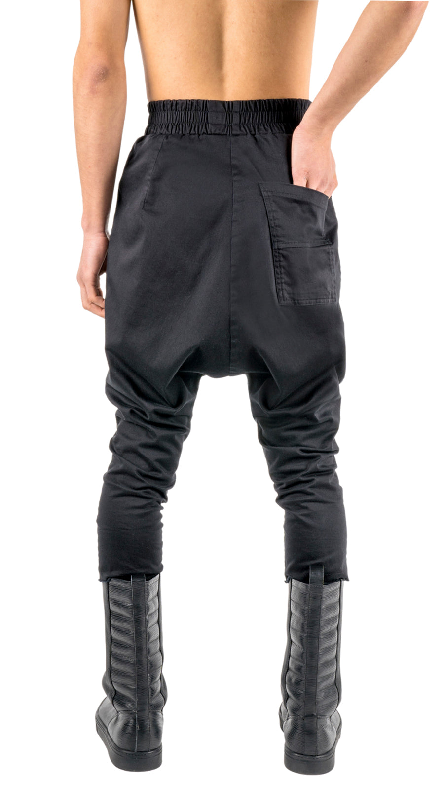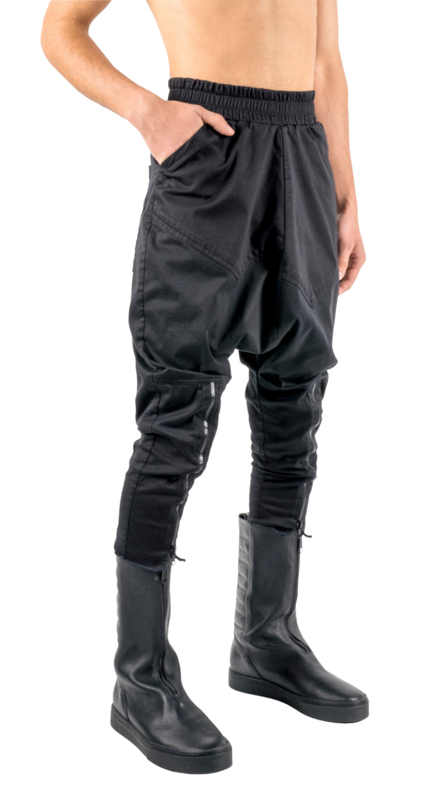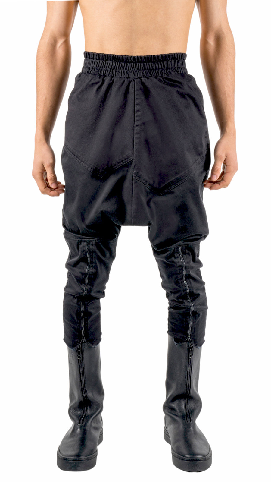 This pair is made with our shiny COTTON, with an elastic waistband, featuring two black zippers, one on each leg on the bottom front, you can wear them both opened or closed, either way you will look cool. The crotch is low, above the knee and the legs slightly tight at the bottom. The front pockets are spacious with a geometric shape and the stitch is detailed. Also, it has a back pocket on the right side.