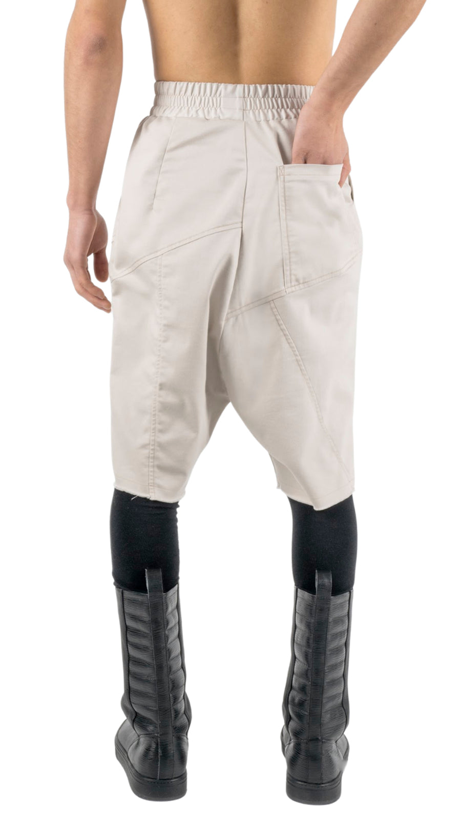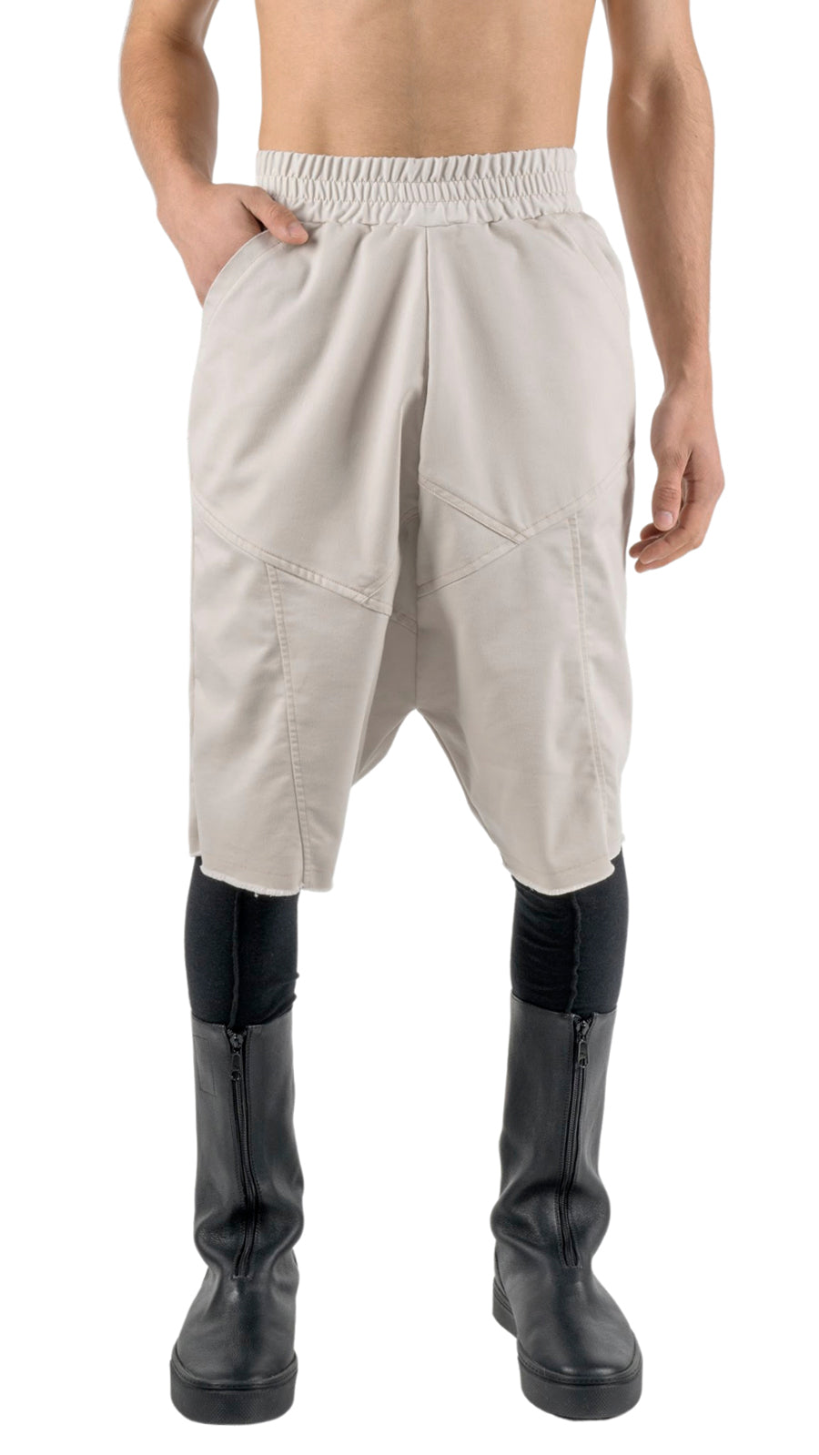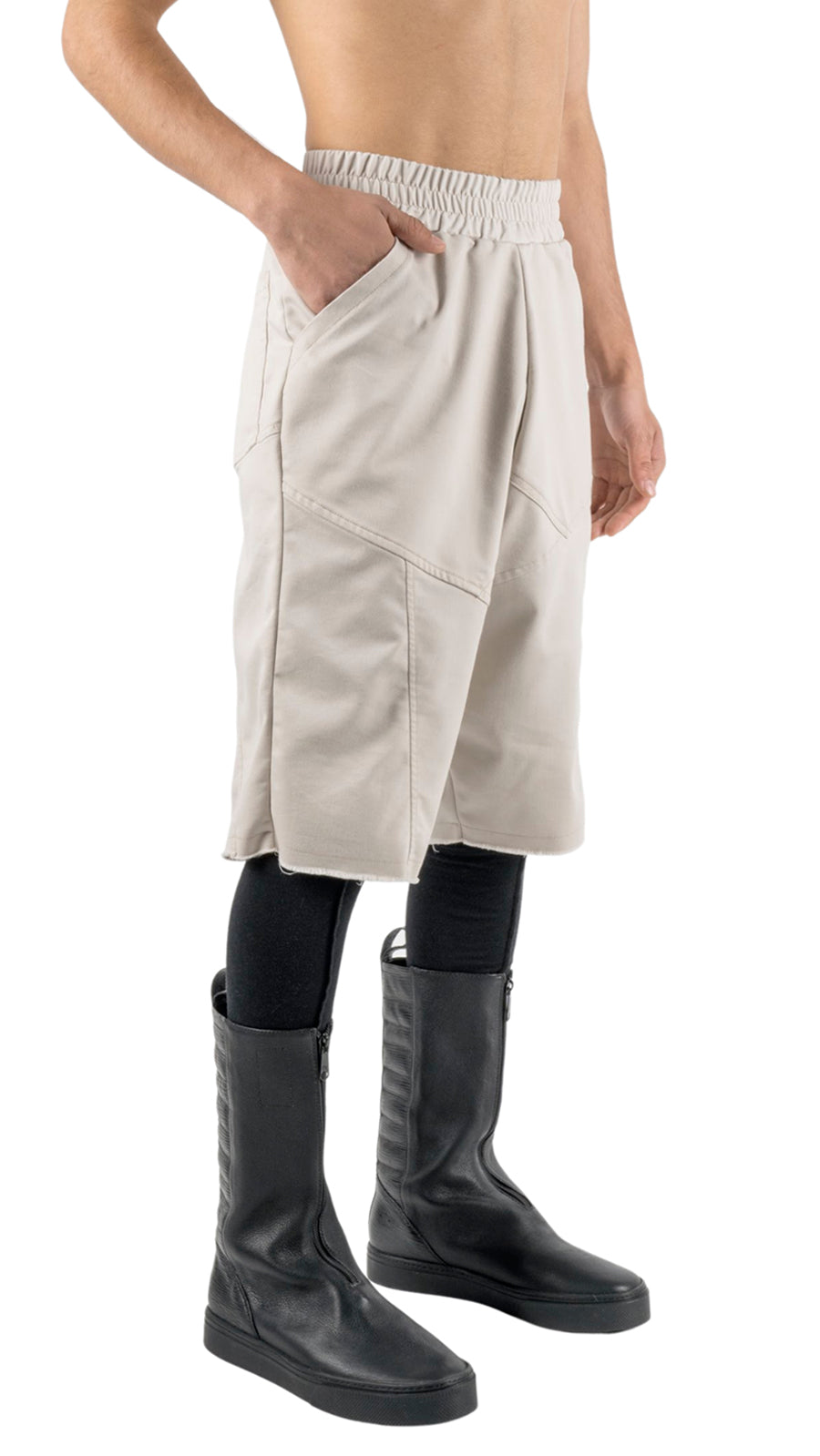 These minimalist shorts are made of Cotton. Features multi-asymmetric seams in the front and back, it has a low crotch. Two side pockets hidden in between the geometric seams in the front and one in the right back. Slightly loose fit with our REVOLUTION COLLECTION featured elastic waistband.