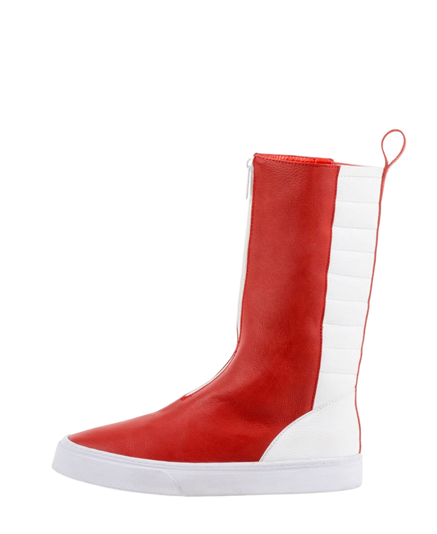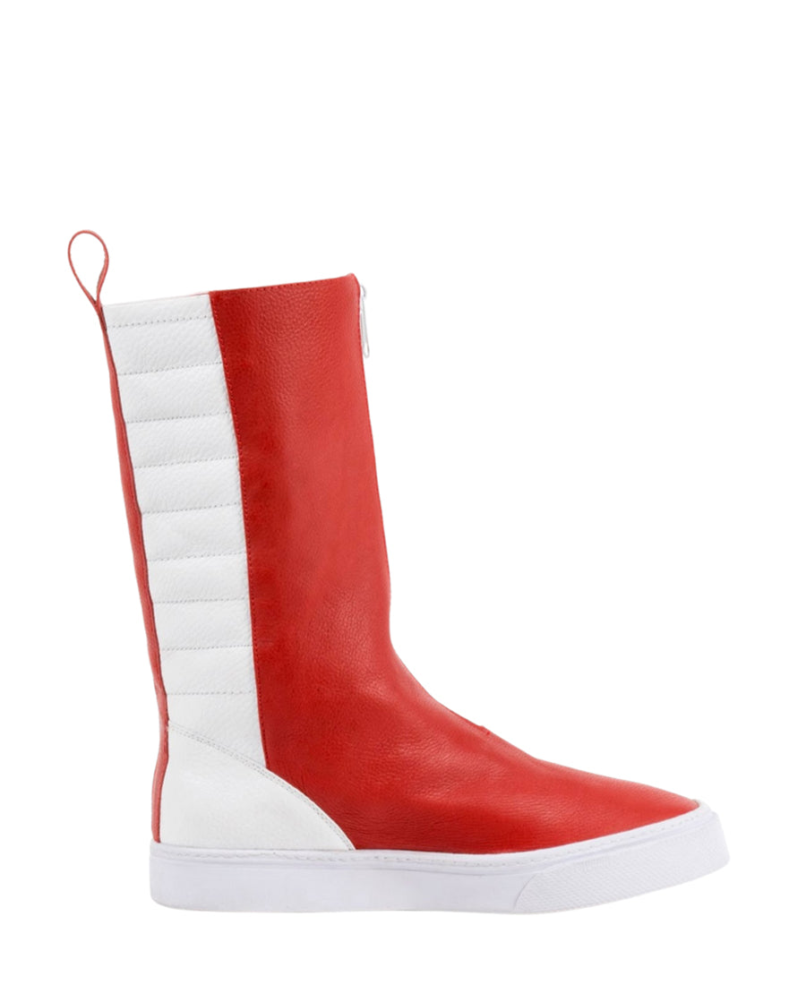 Made with Genuine Cow Leather (Napa Plena Flor). The front is made with Red leather and has a white zipper. The white part of the boot has comfortable padding featuring a Red stripe. The lining of the boot is made with soft Red leather. The soles are made of white rubber.