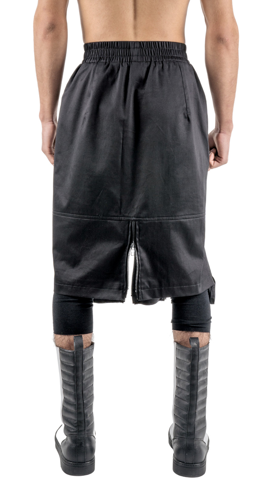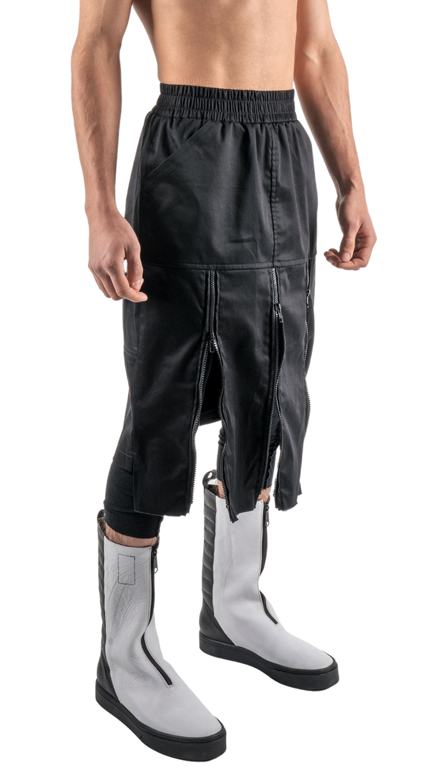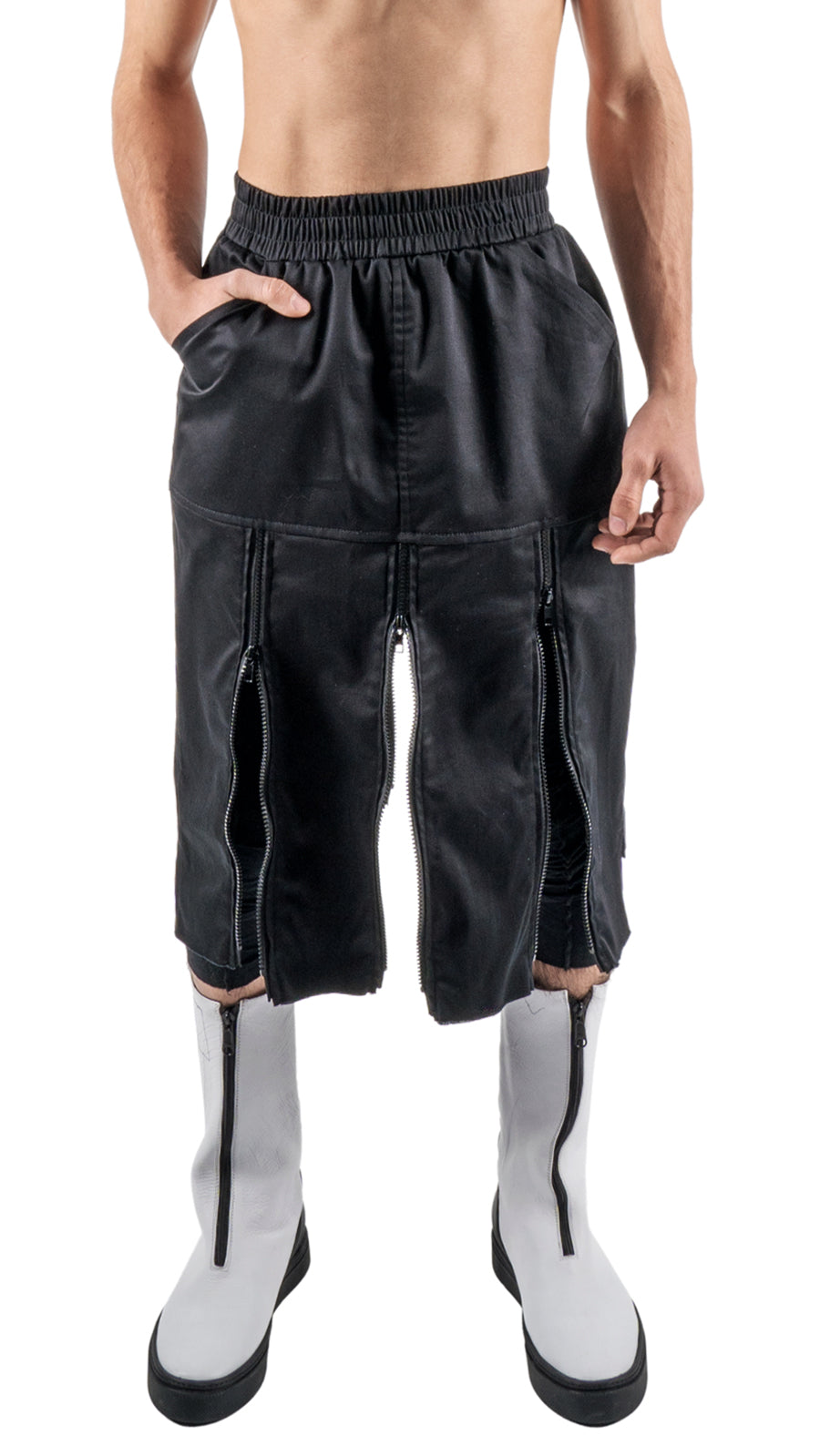 This is made with our black shiny Cotton. It features three front zippers in the front which you can adjust in different heights. It has one more zippered slit on the back. It comes with two spacious side/front pockets and elastic waistband. Perfectly done hem on the back and raw on the front. Genderless style. you can combine it with your LOCO ONE LOW TIGHTS to wear underneath.