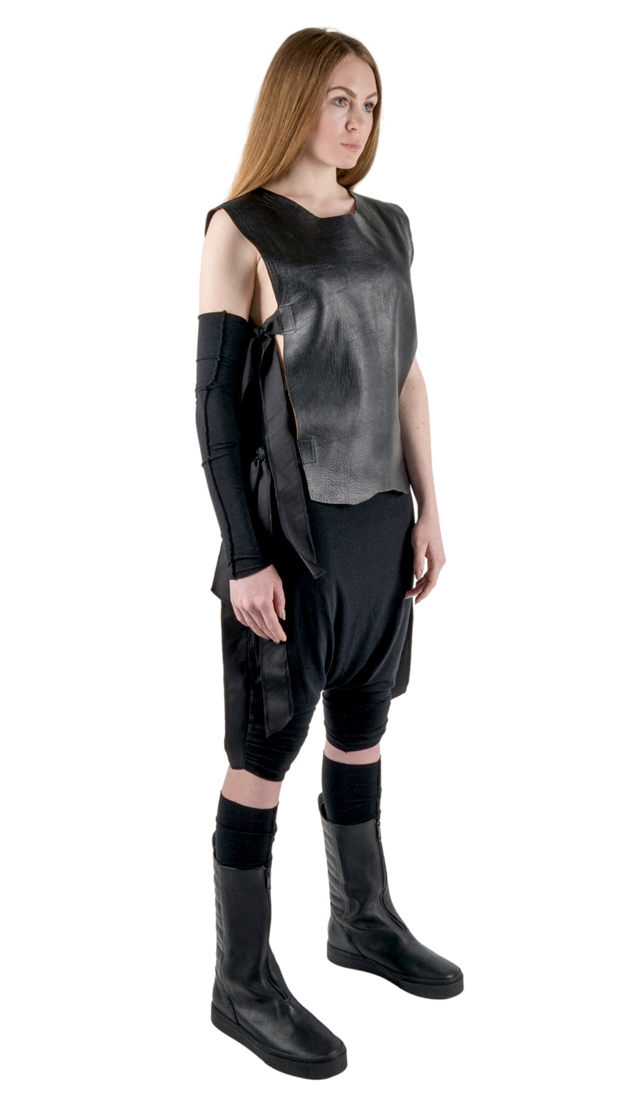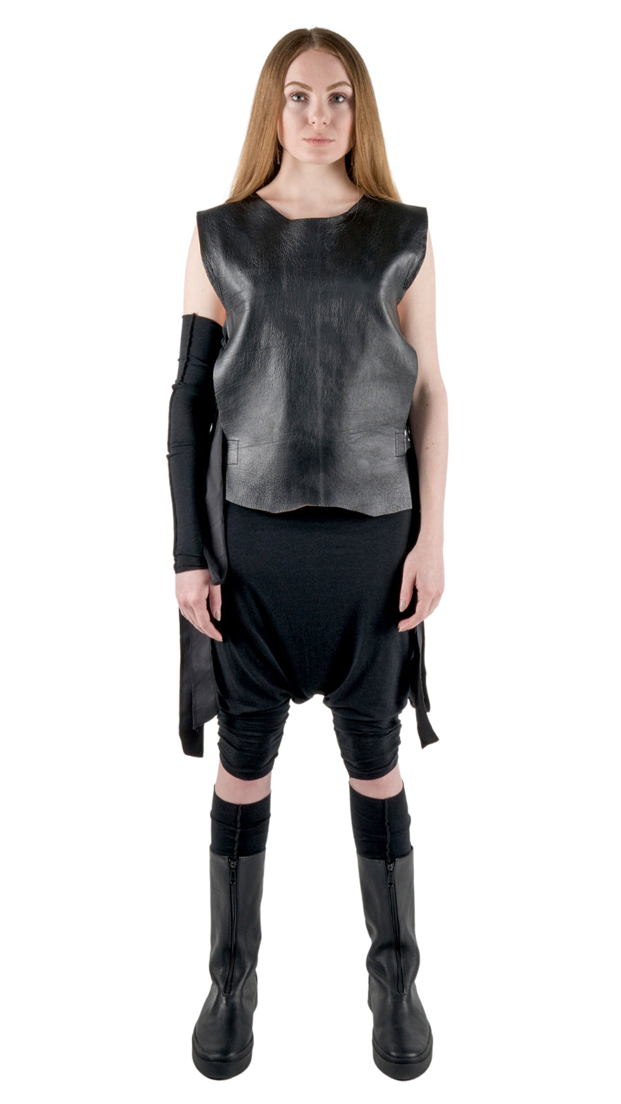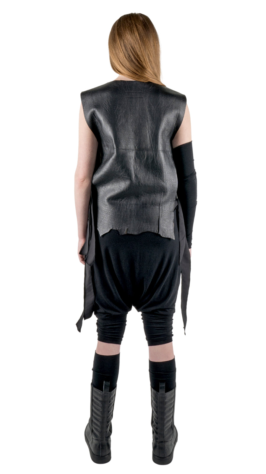 Made of soft, Lamb LEATHER in black color. The straps are made of COTTON as well. This cool VEST features rough finishes of the hem, the shape of it is the natural cut of the leather (every piece will look different) It has a pressed lining for more comfort.