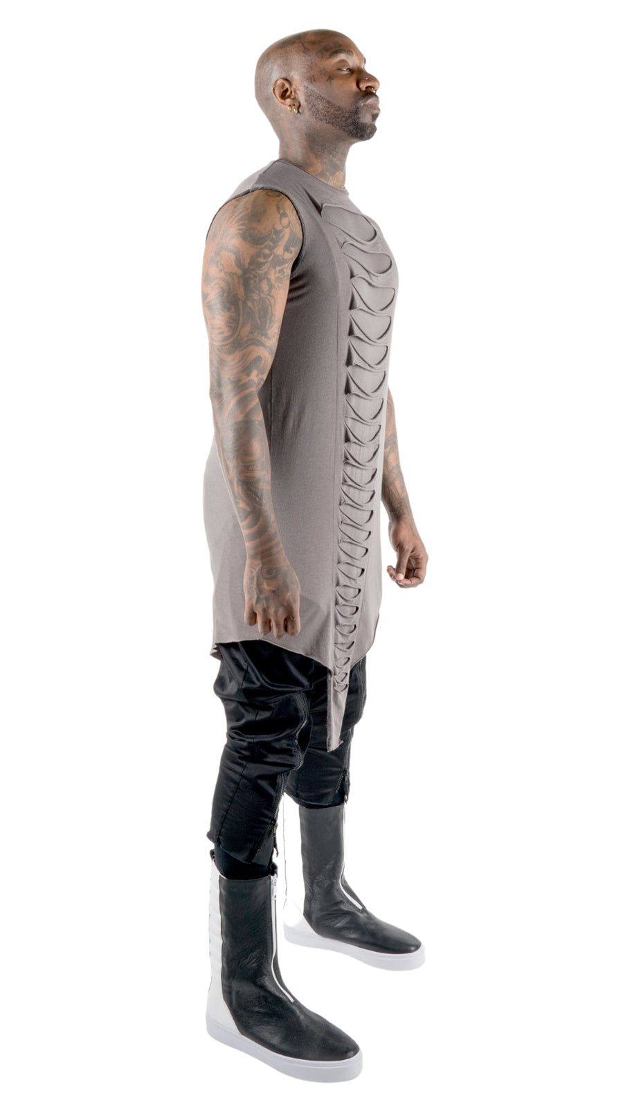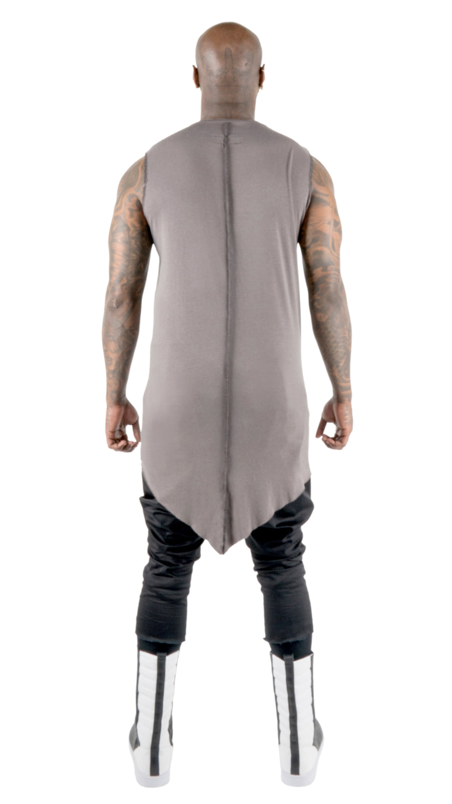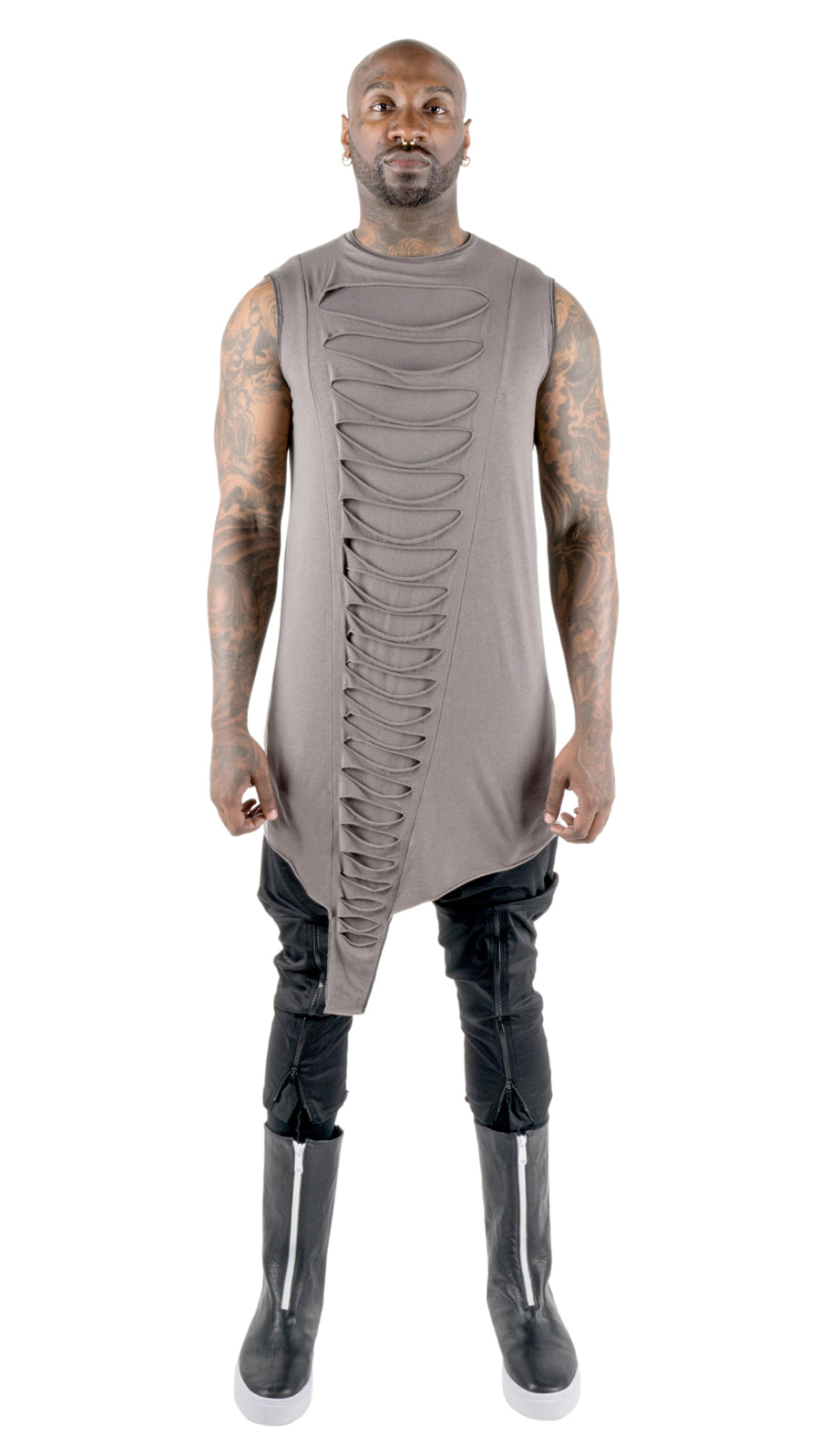 Made of BAMBOO Feather Jersey. This elongated, sleeveless, cool top has a round neckline and shoulders seams with a rough finish. The unique feature of this apocalyptic design is that it has tears across the double fabric from top to bottom on the front, also it has a long horizontal upside down seams on the back of the garment. The hems have different levels of cuts with raw finishes.