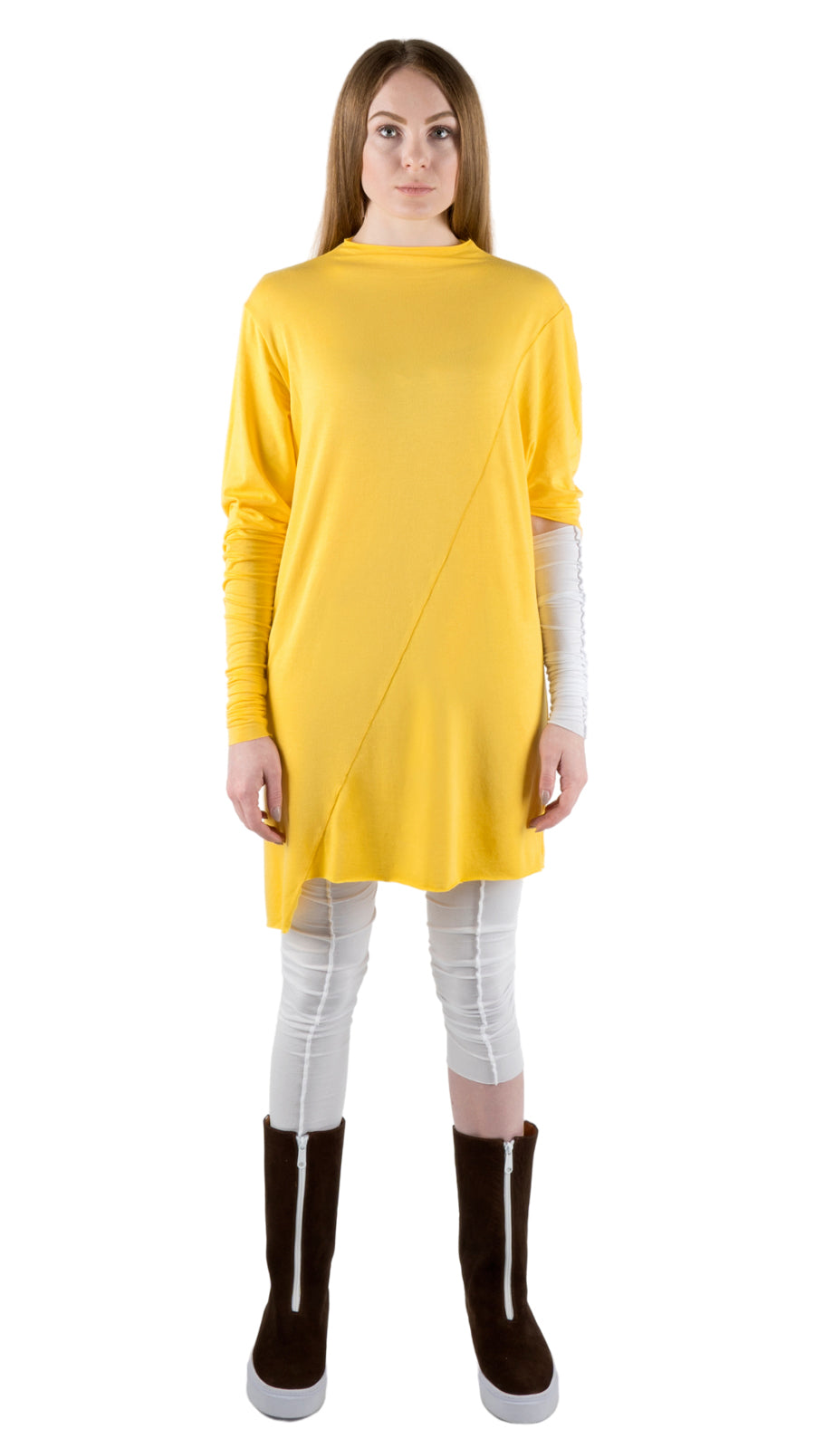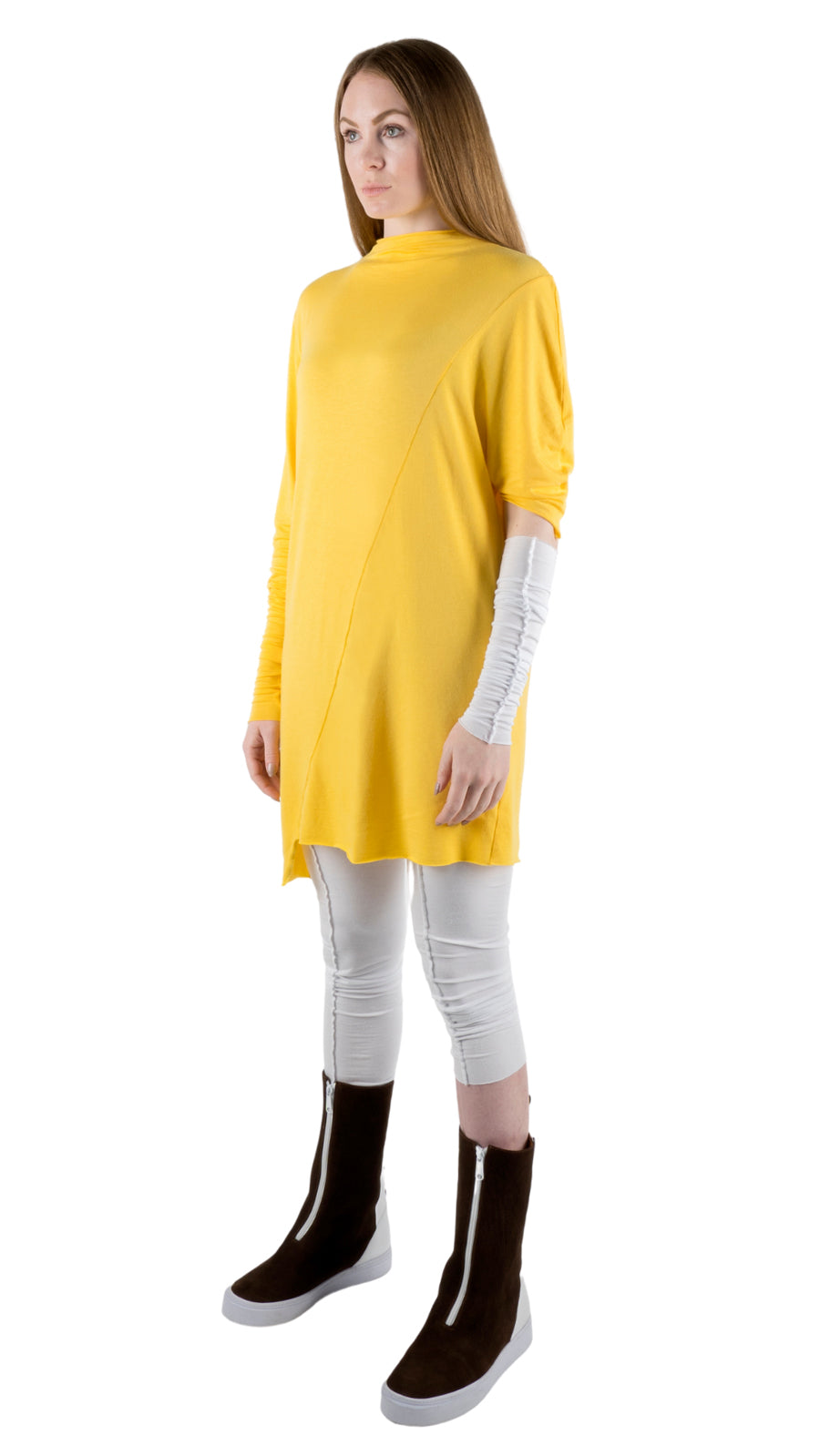 BAMBOO Feather Jersey with futuristic, minimalist look. this Genderless Top has a long seam across in the front and back, left short wing sleeve with seamless shoulder, and an extra long sleeve on the right. This t-shirt is asymmetrical and has raw hems. The feature of this cool t-shirt is the different length of the sleeves, which gives you that Avant-Garde look.
