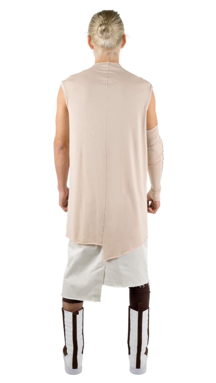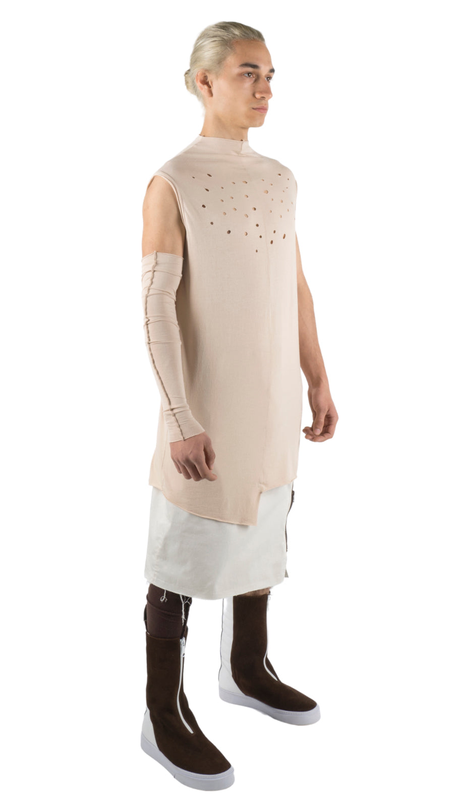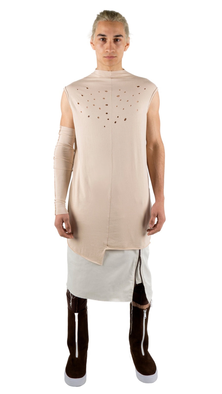 Made of BAMBOO Feather Jersey. Sleeveless, with long neck line and front holes that look like stars in the sky. It has a long vertical seem in the front and back. Futuristic, gothic look. Slightly loose fit, rough finishes on neckline and shoulder seams. Asymmetric and raw hem.