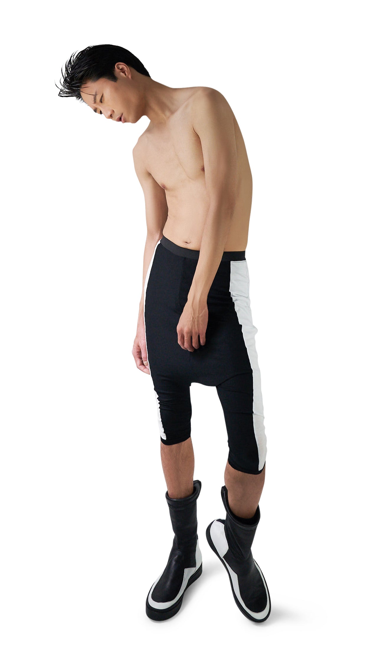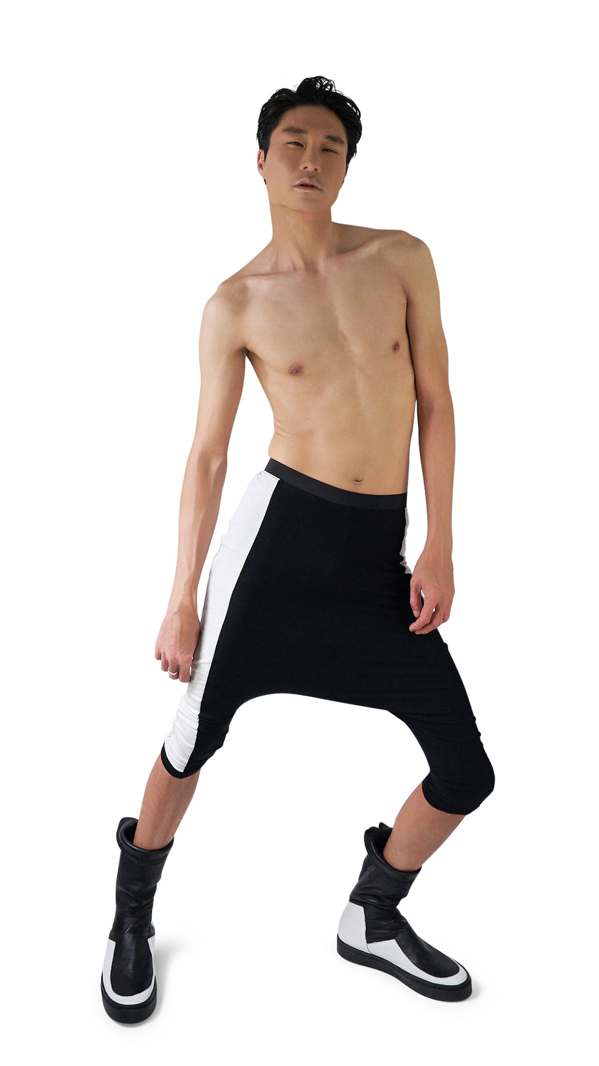 These stretchy Genderless Leggings are made with natural materials only. Main composition is BAMBOO. They feature a low crotch with minimalistic and futuristic look. With asymmetrical cuts, elastic waistband and hems. This is perfect to wear by itself or underneath of any of our other designs, giving another look to your outfits.