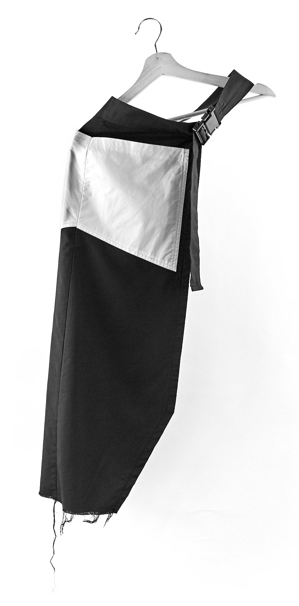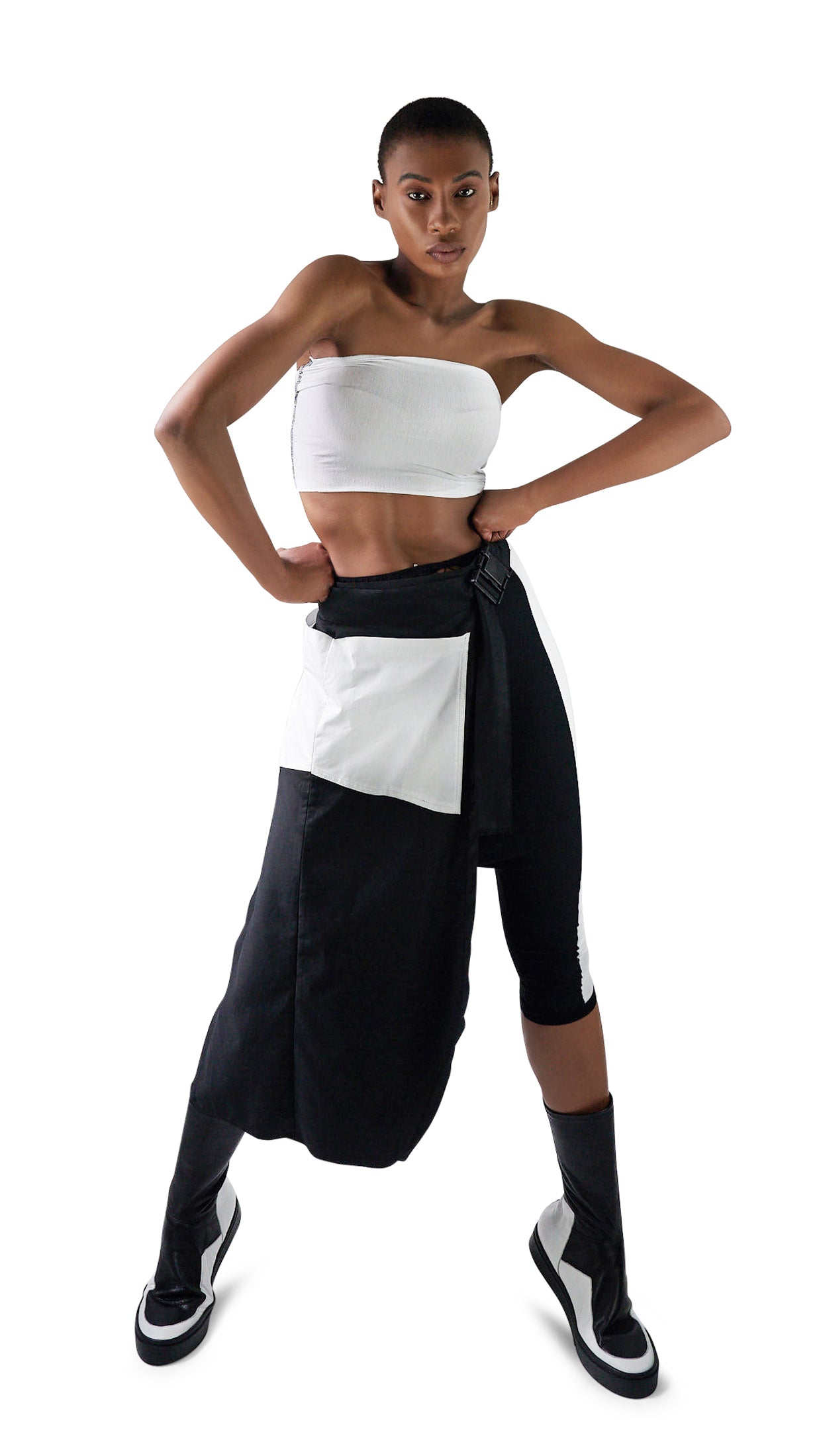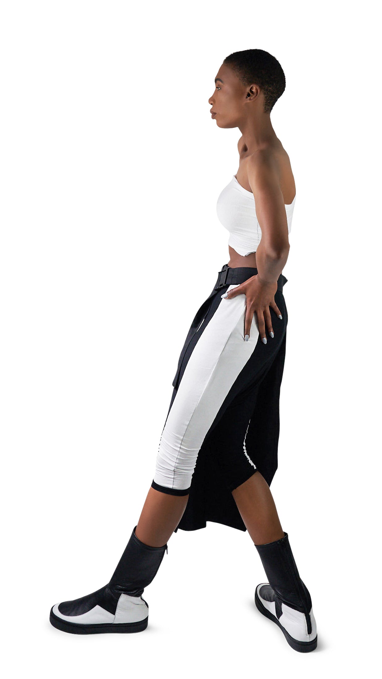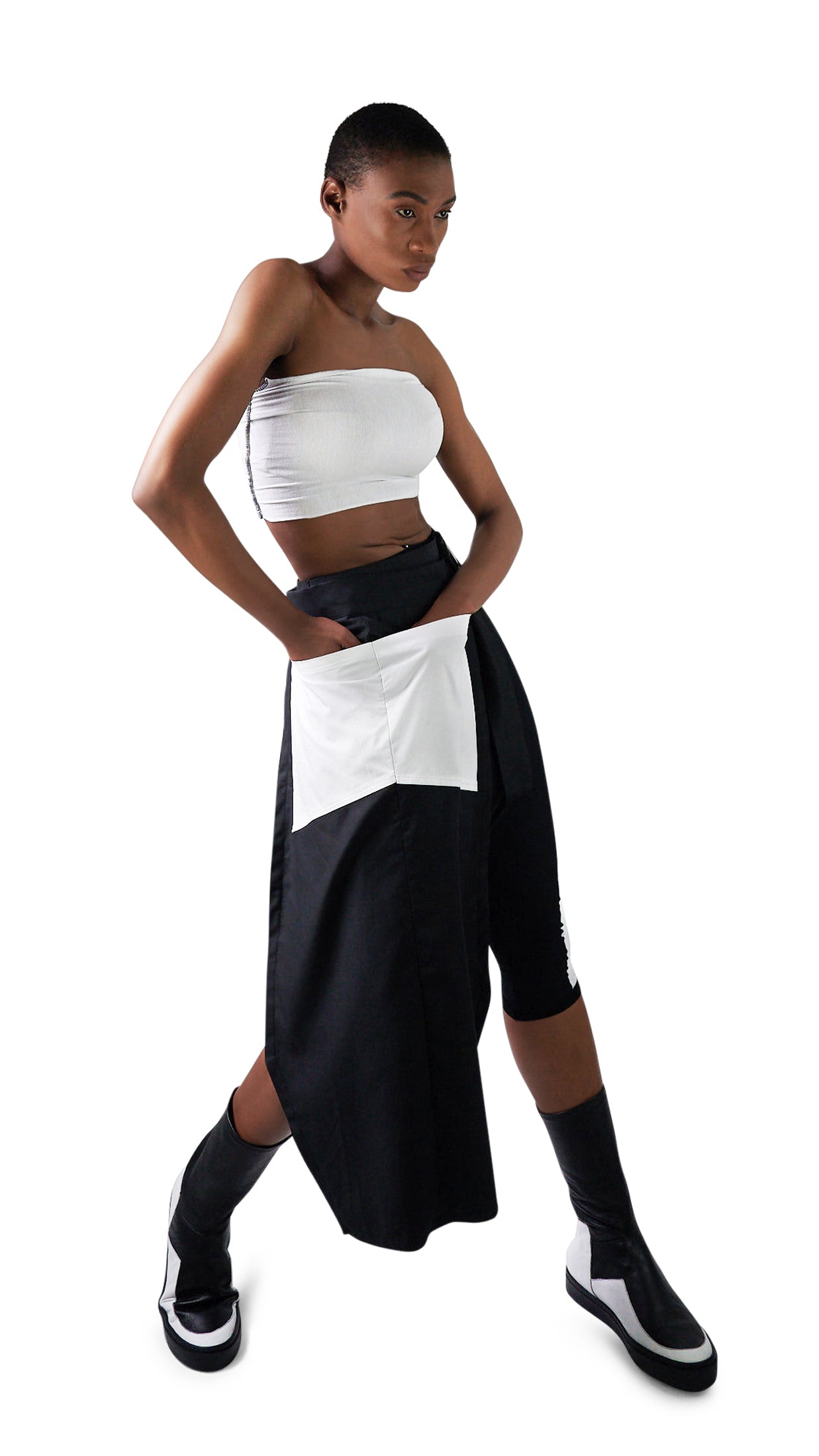 Unisex Half Skirt made with 100% COTTON. Asymmetrical cuts, Futuristic look, Raw hem, spacious front and back pocket with opposite color. It features the waist strap with a buckle for more comfort when fitting. This is perfect to wear underneath to add on to your outfits, to give another look.
