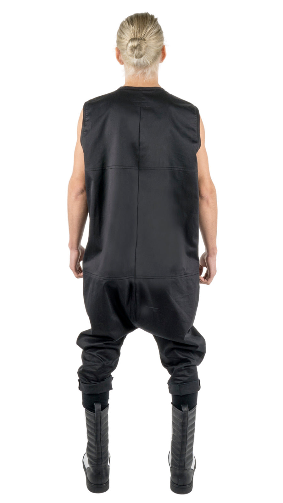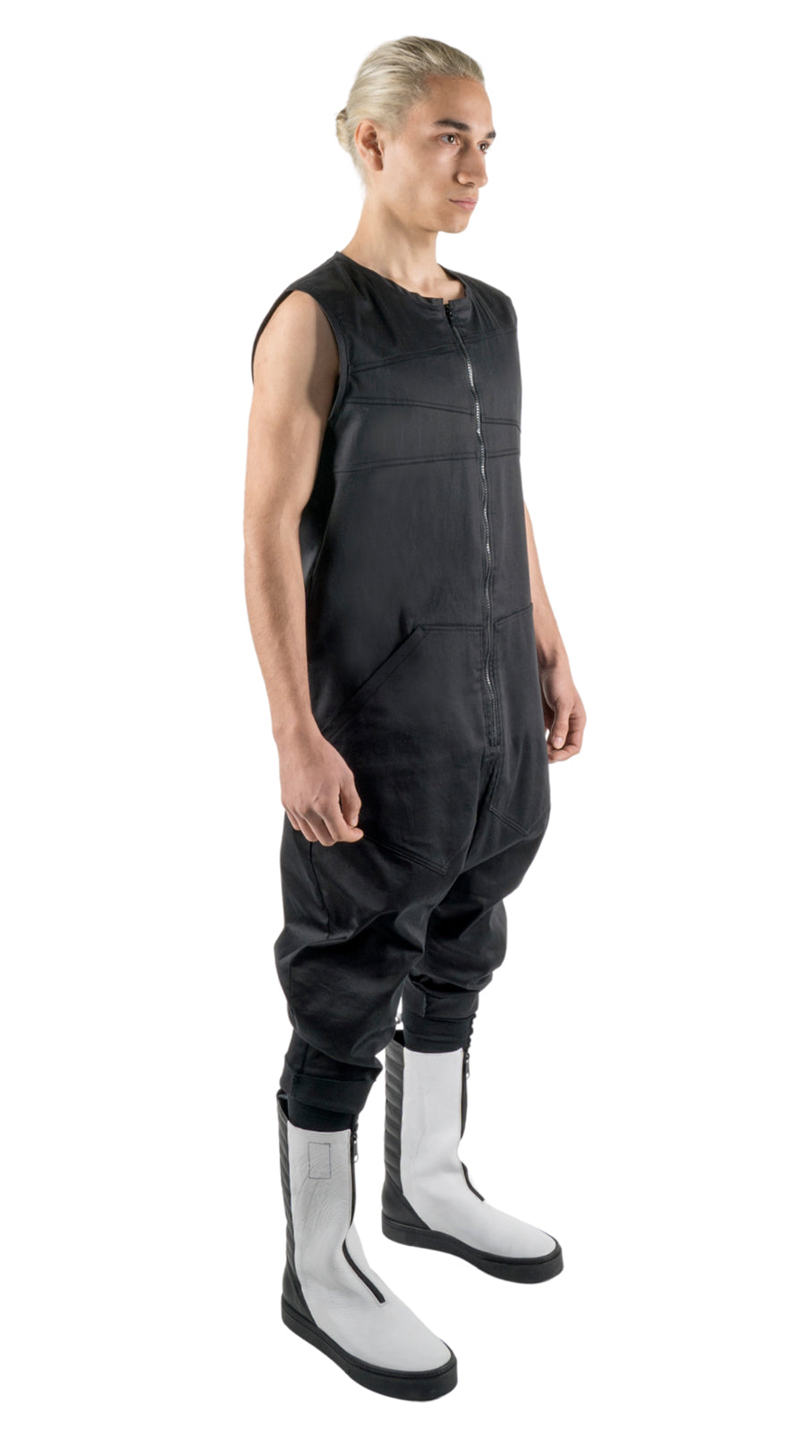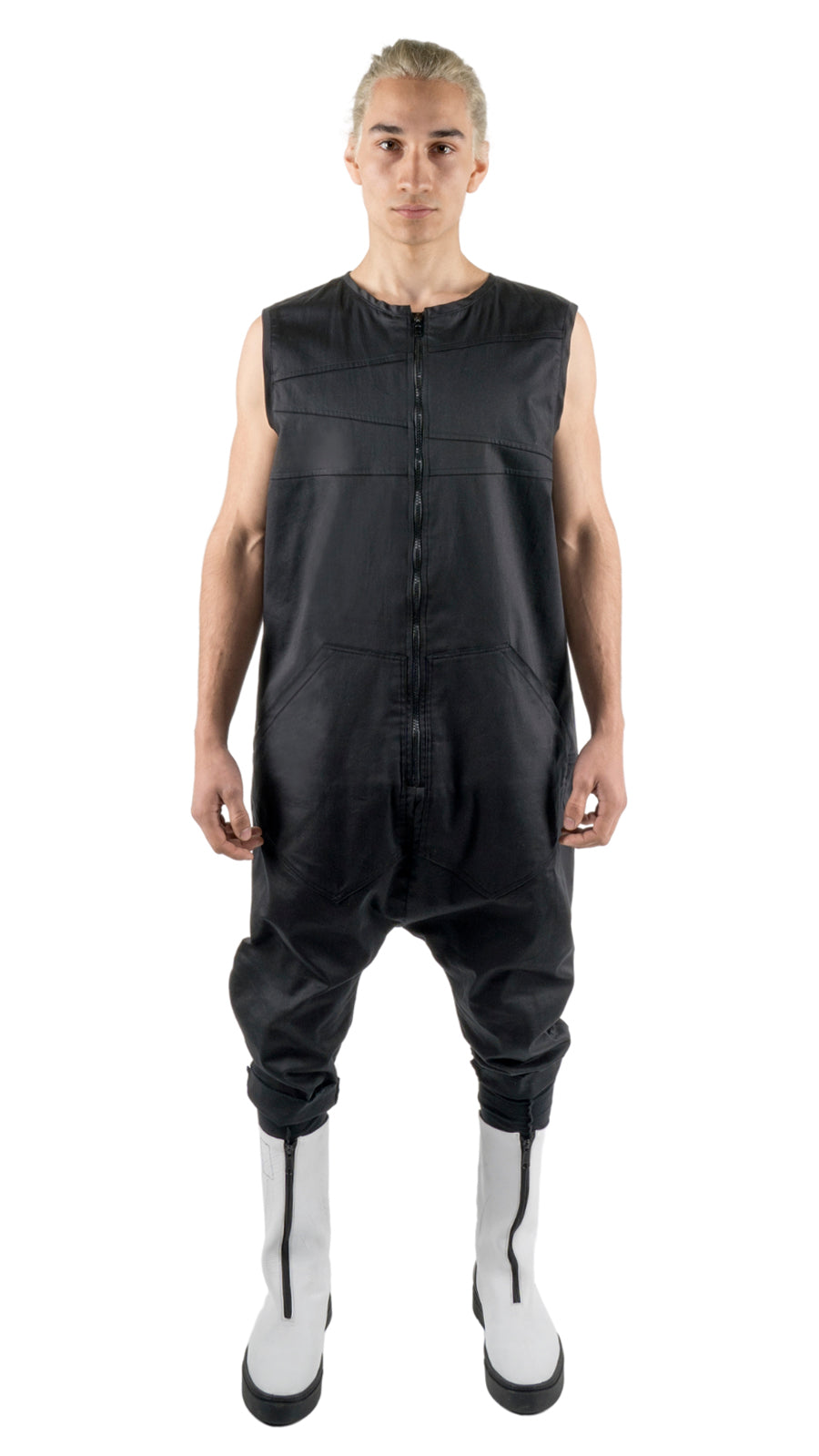 For guys with a sophisticated taste. This Jumpsuit is made with our shiny Cotton. it has that serious, gothic look but at the same time it will make you feel like a futuristic pilot. It features asymmetrical seams on the chest part and two very spacious pockets in the front, raw hems.