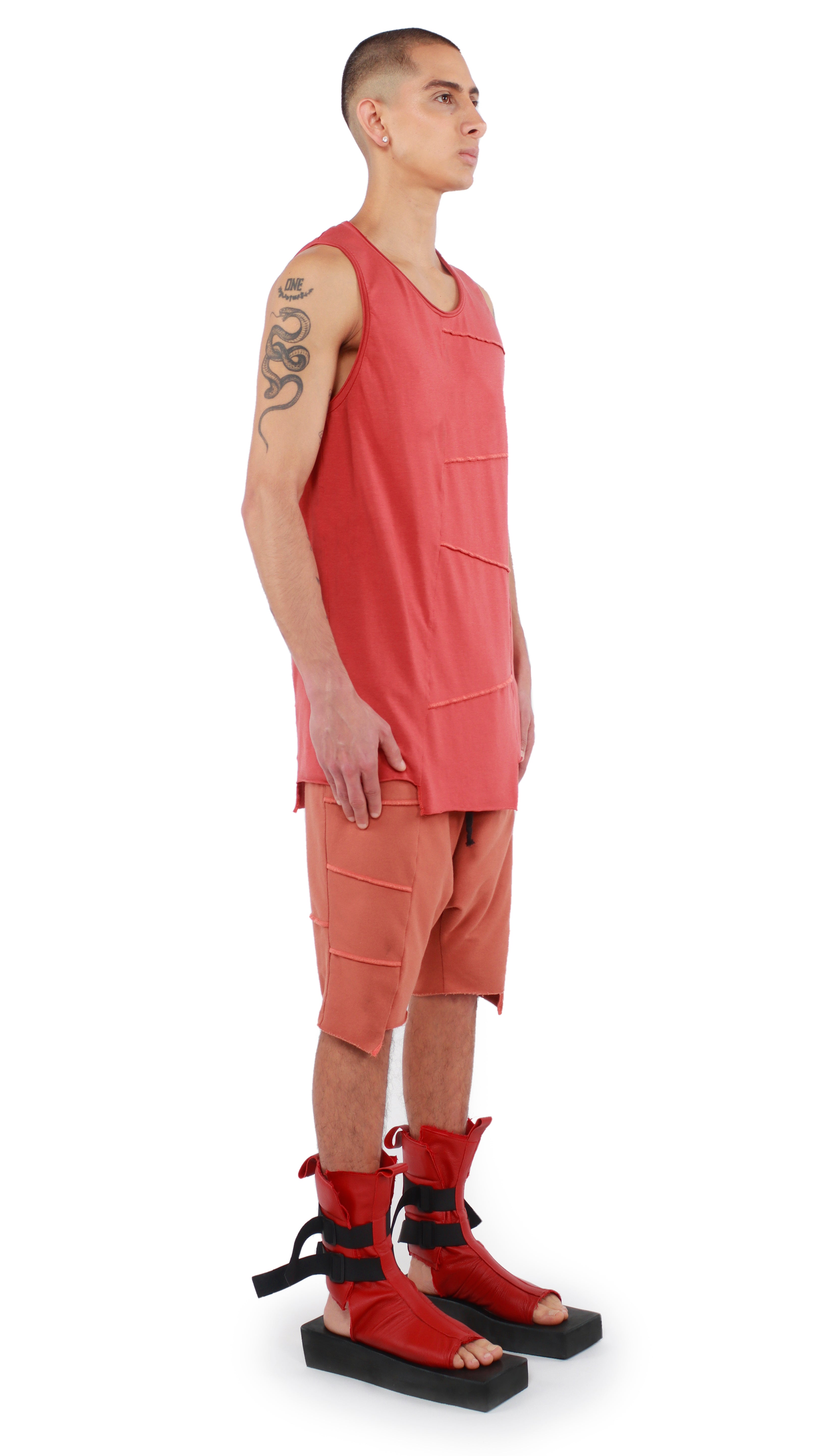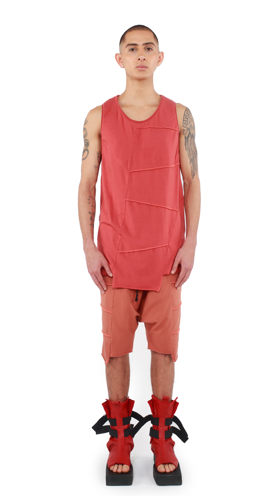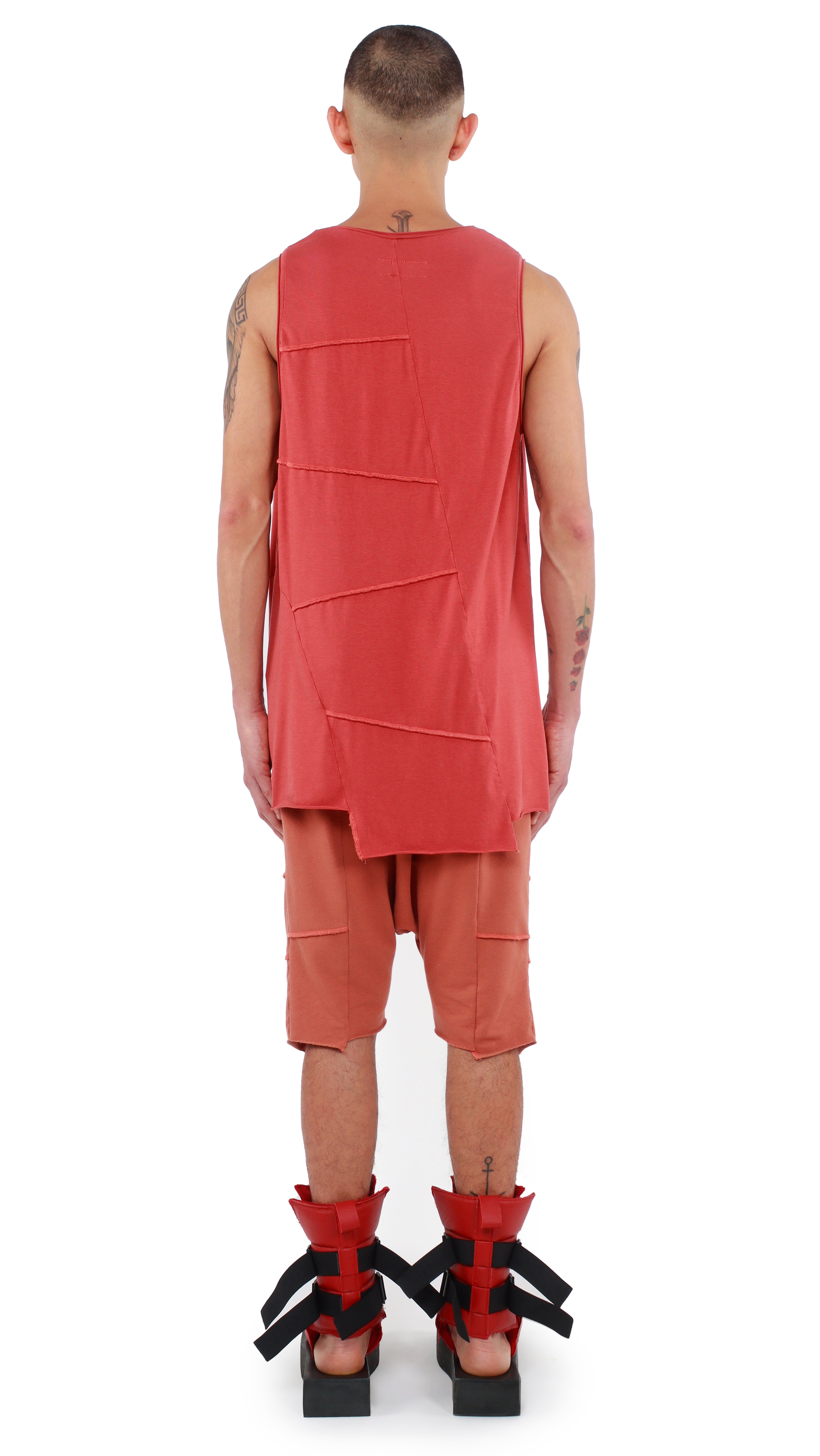 One of a kind elongated Tank Top is gender neutral and custom-built with the highest qualities of fabric and materials. It has a round neckline and arm holes with raw finished edges. The unique feature of this Avant-garde design is the asymmetrical upside down seams across the front and back of the top. The hems have different levels of cuts with raw finishes. This top is extremely comfortable and perfect for someone who is looking to stand out but still looking to be comfortable.
